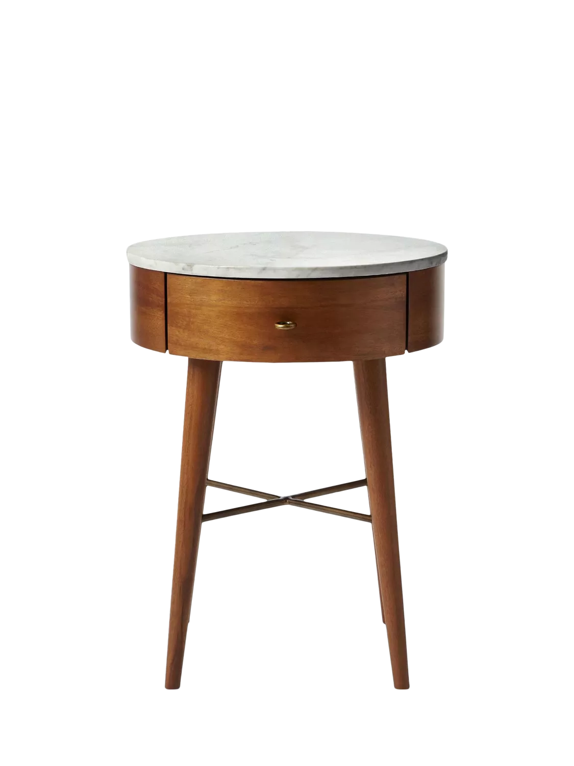 Sleek and modern bedside table. The metal pull contrasts nicely with the wood and the marble top is unique, thanks to variations in the marbling. The single drawer opens smoothly on solid wood glides.