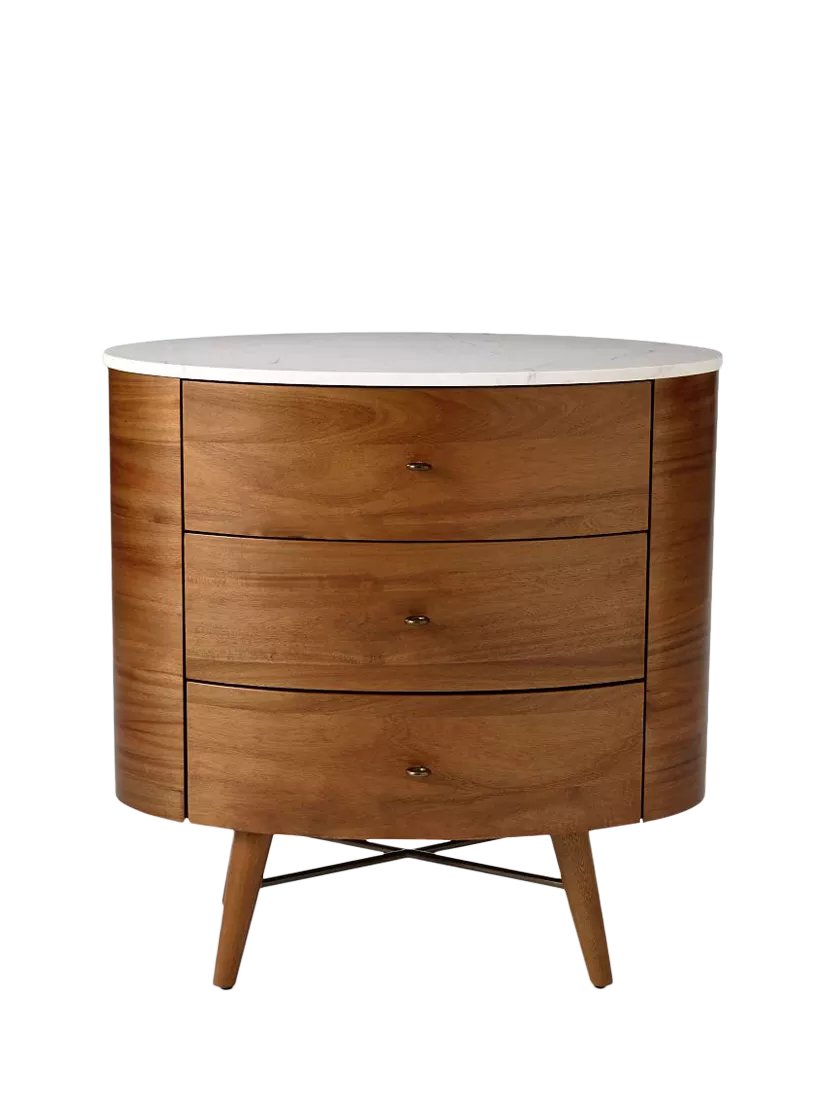 - Solid eucalyptus wood legs and frame Engineered wood sides covered in acacia wood veneer. Covered in a water-based Acorn finish. White marble top.