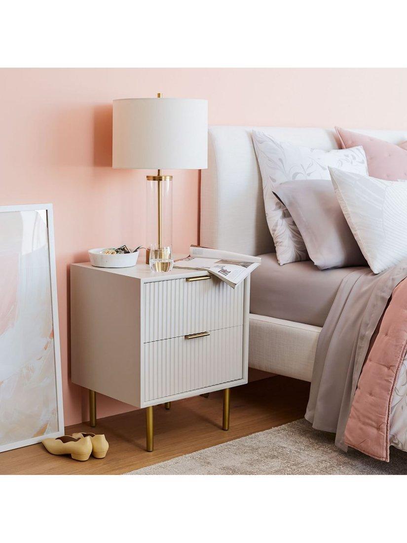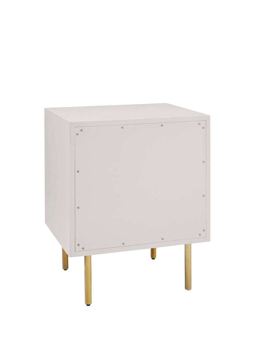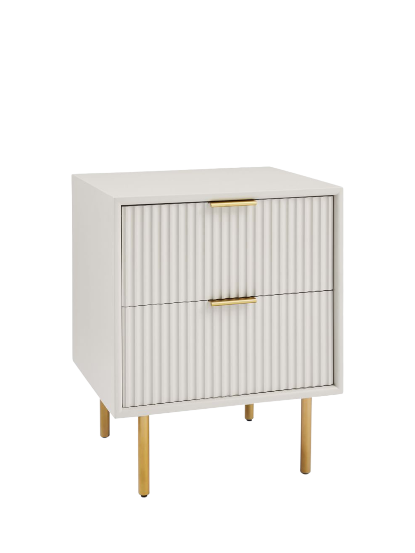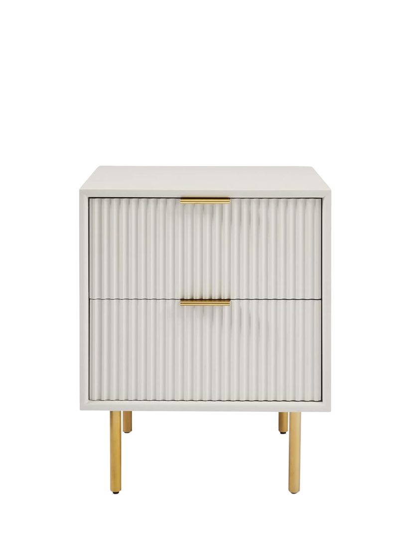 Bright and glamorous, the Quinn Bedside Table stands out with its fluted design and slim metal hardware evoking classic Art Deco design.