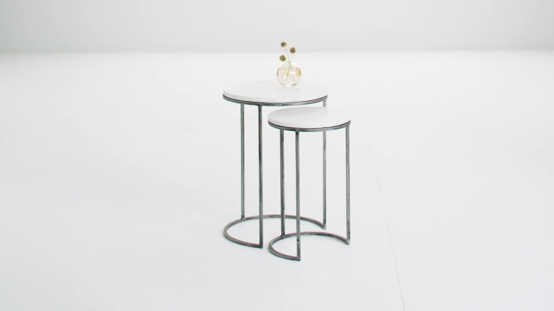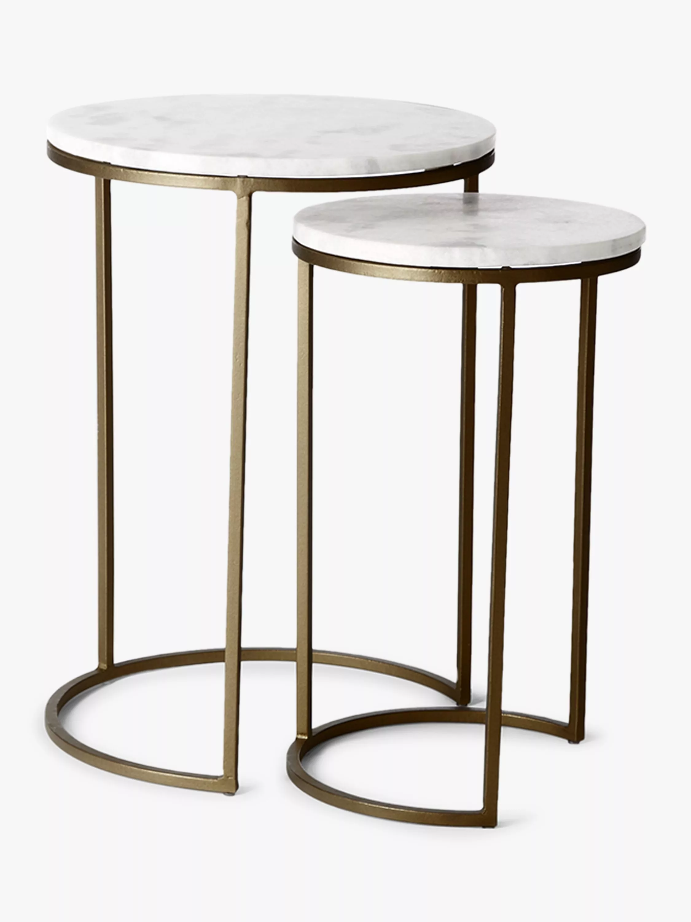 These side tables are made with sturdy, natural marble surface tops and supported by an iron frame in a burnished bronze finish. They're ideal for smaller spaces, and the smaller table can nest neatly underneath the larger table. Natural variations in the colour and veining of the marble can be expected, as its natural design means each piece is unique.