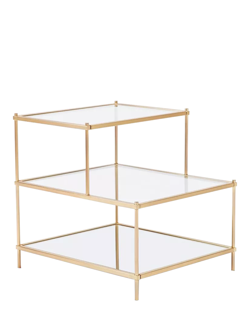 Inspired by mid-century design, the Terrace Side Table has tiered glass shelves that appear to float above a mirrored glass base. With its refined silhouette, it's perfect for placing on either end of a sofa or beside a bed. Has an Antique Brass finish on the metal frame, a mirror bottom shelf and a clear, tempered glass shelf and top.
