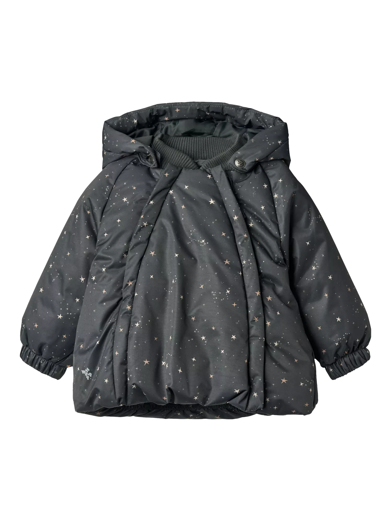 Winter puffer jacket with detachable hood, isolation and polyester lining, double zippers, and elastic cuffs. Features reflectors and printed stars. Water-resistant to keep little ones dry.