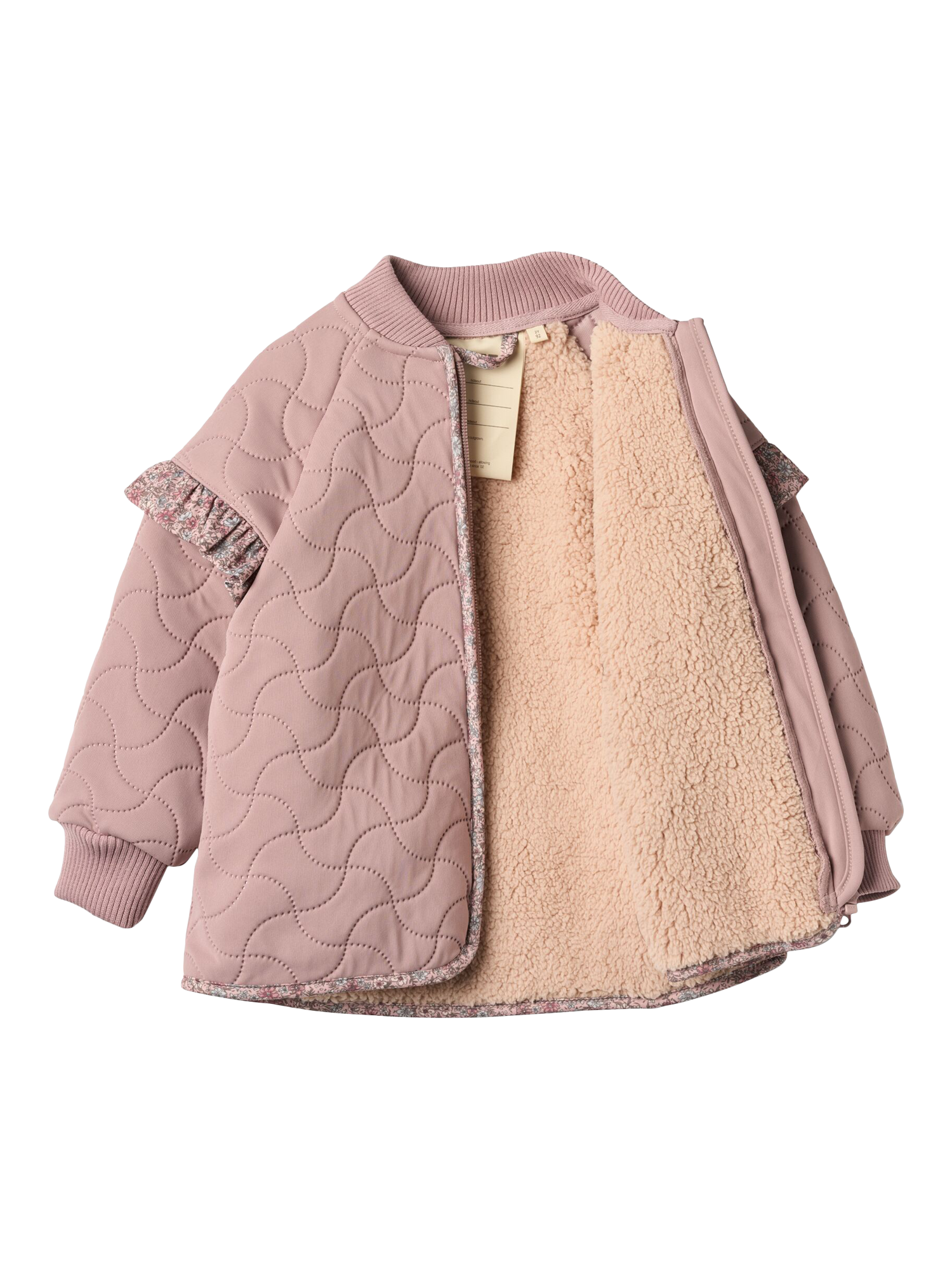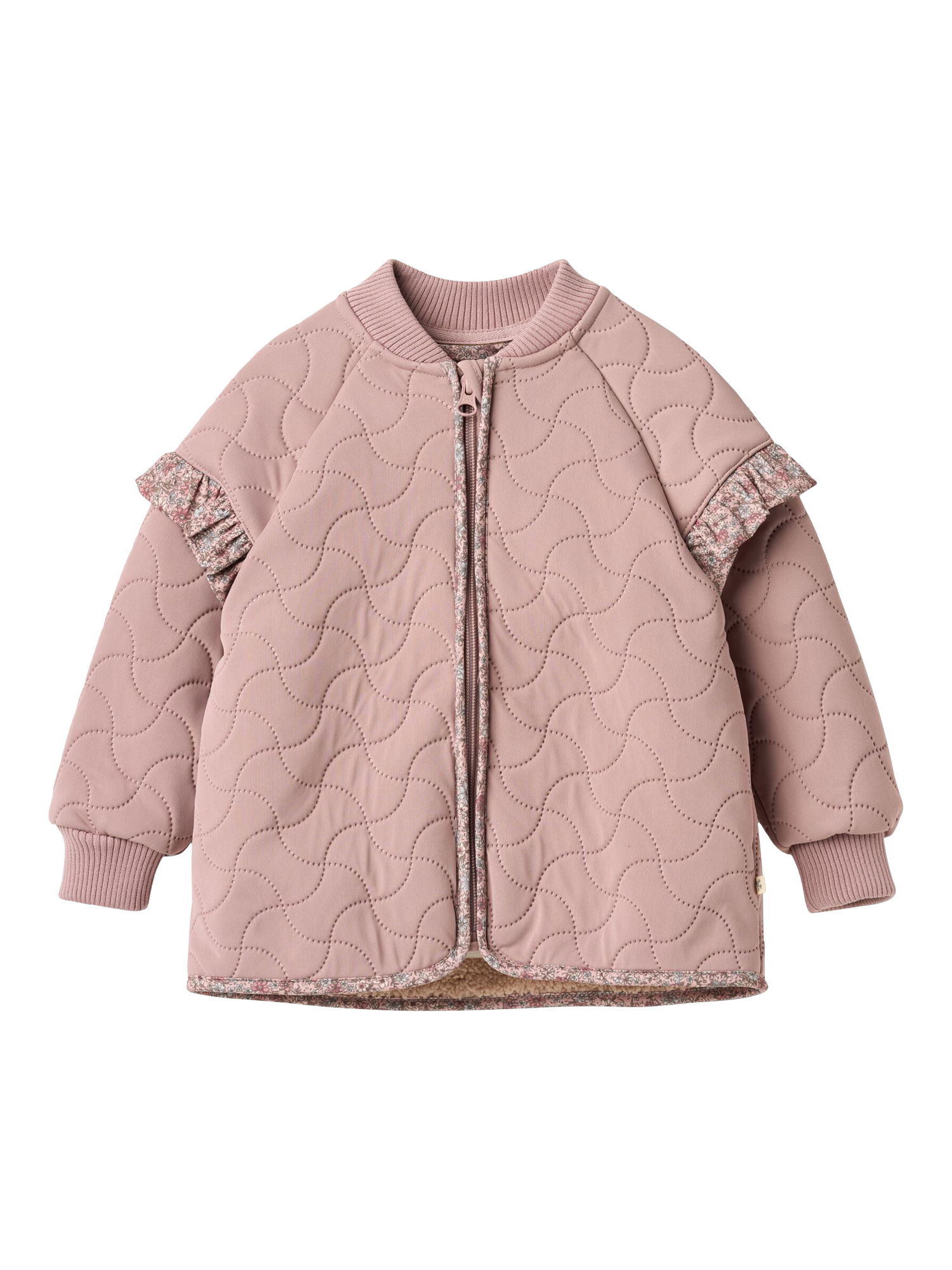 Wheat’s piled thermo jacket for babies is made from recycled polyester with soft pile lining. Features rib collar and cuffs, ruffles on shoulders, dropped shoulders, chin guard zipper, reflectors, and signature Wheat details. Lightweight, comfy, and water-repellent, perfect for layering or transitional weather.