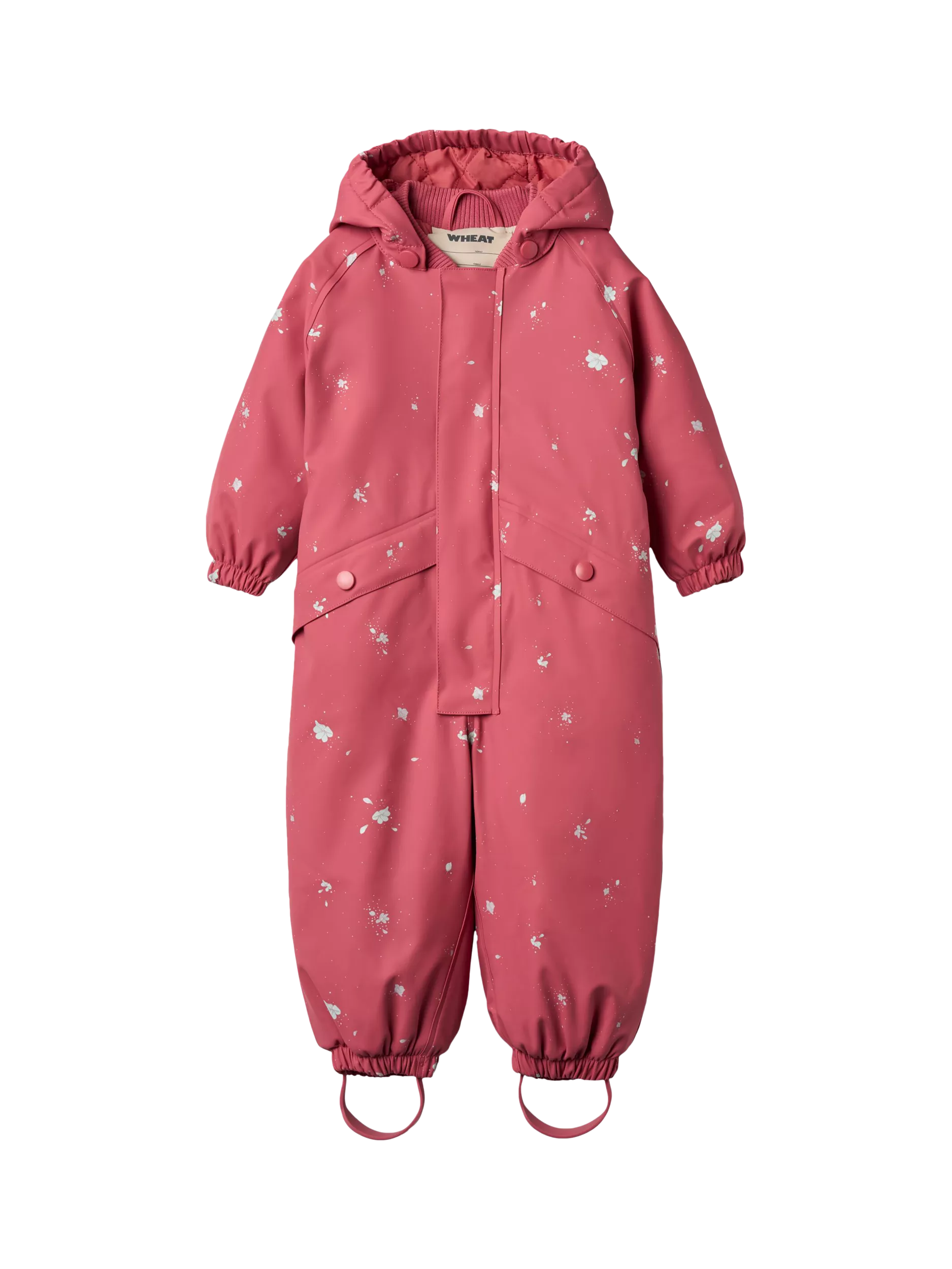 A bBreathable, waterproof thermo rain suit for babies, offering light padding. It features a detachable and adjustable hood, elasticated back casing, press-button pockets, a detachable rubber foot strap, elasticated cuffs, and a waterproof zipper. Finished with reflectors to enhance visibility.