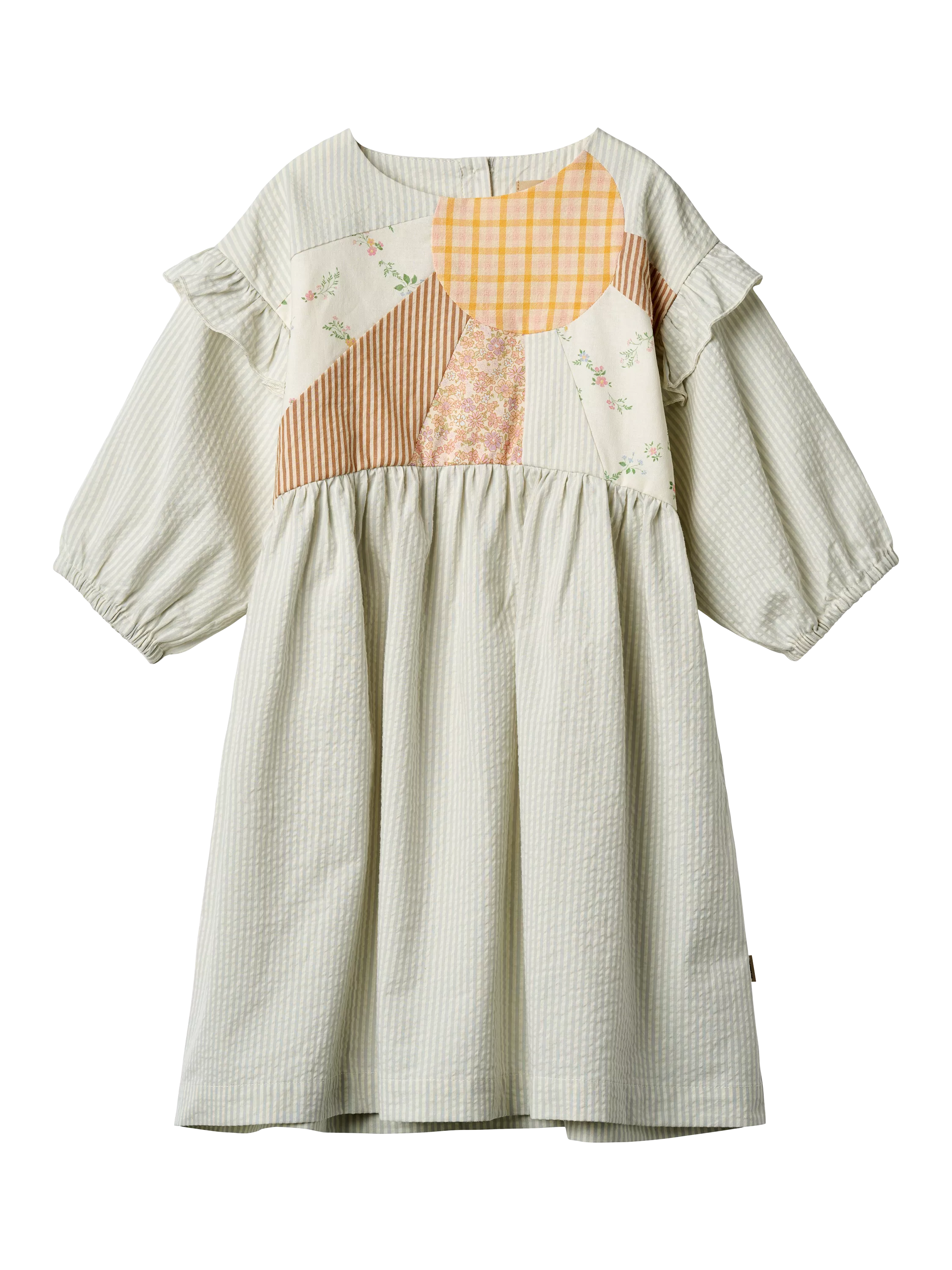 This charming organic dress by WHEAT features an easy fit with 3/4 sleeves and cute patchwork, perfect for play days or special occasions. Button back for easy dressing.