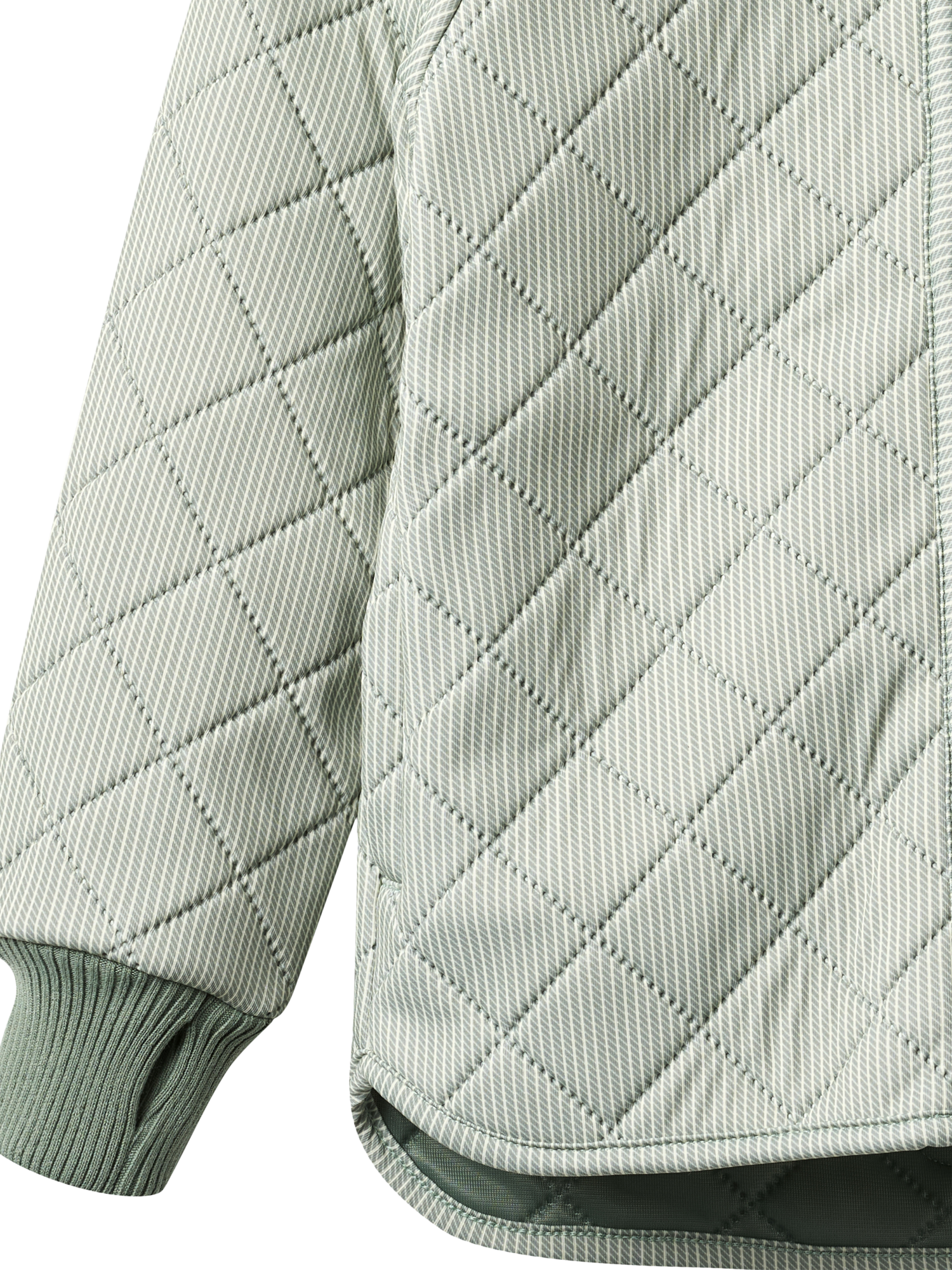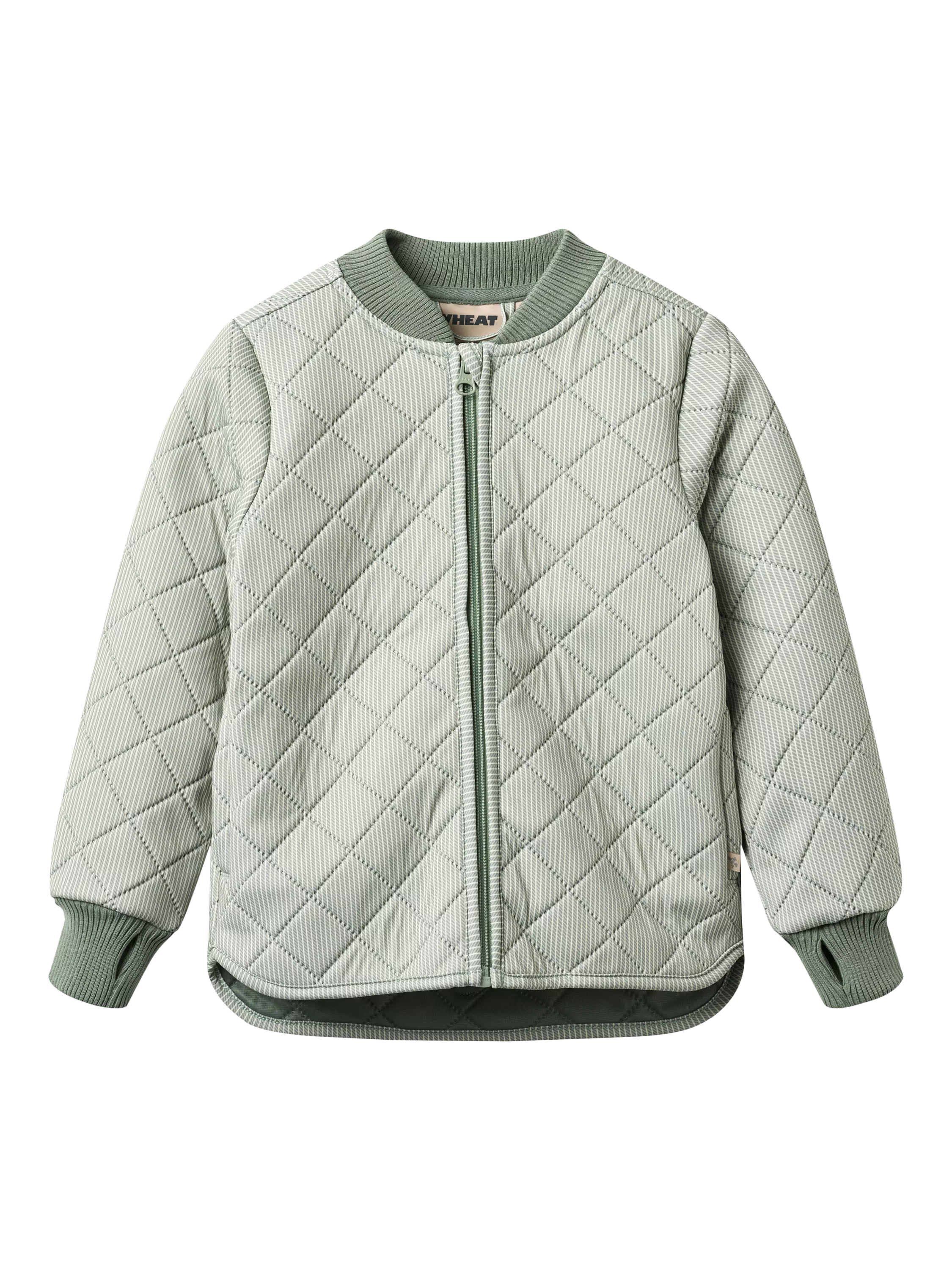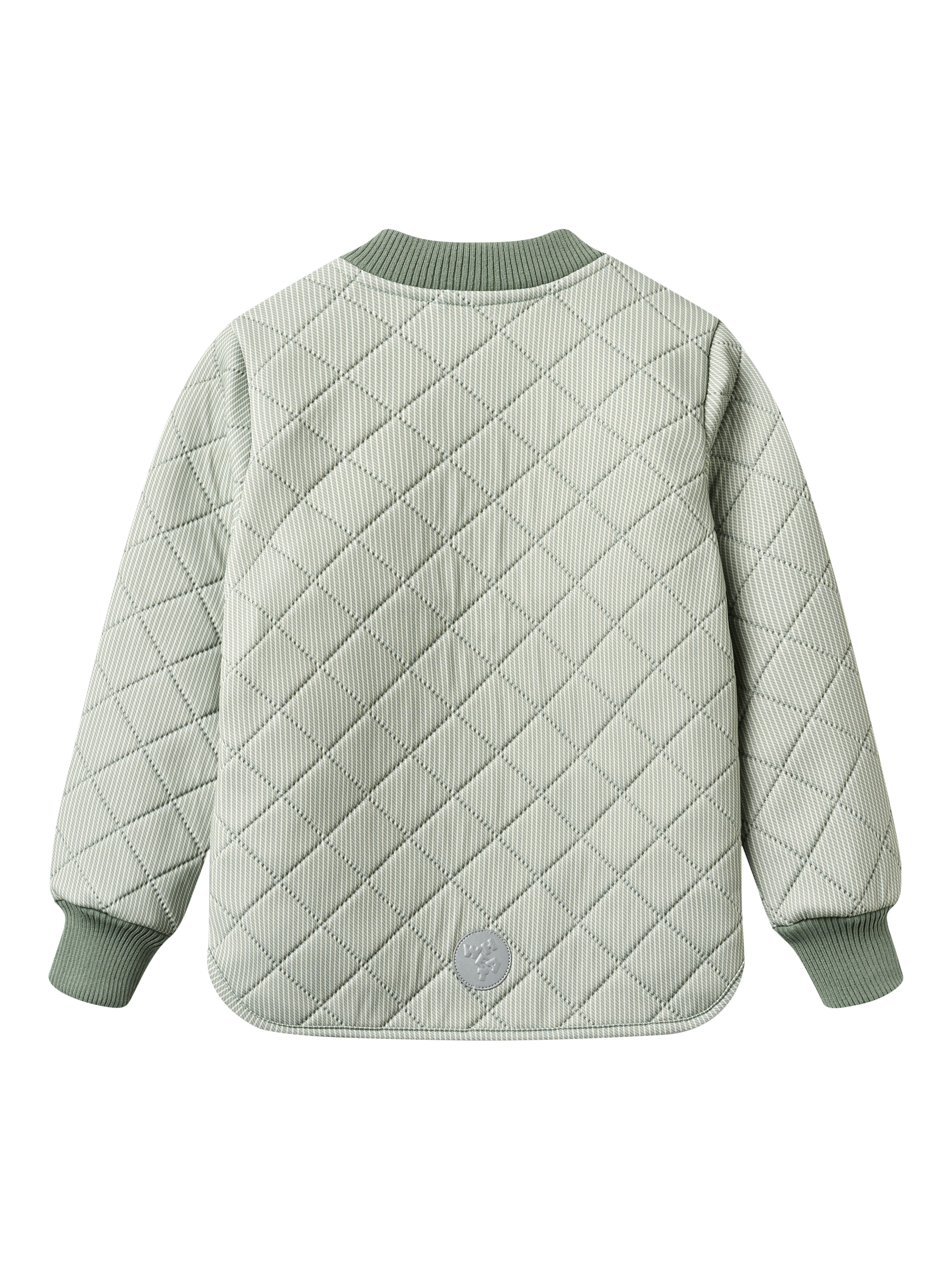 The Loui thermo jacket for children has contrast rib collar and cuffs, with thumb hole, welted side pockets, zipper with chin guard, and reflective back badge. Soft, lightweight, and water-repellent, ideal for damp weather.