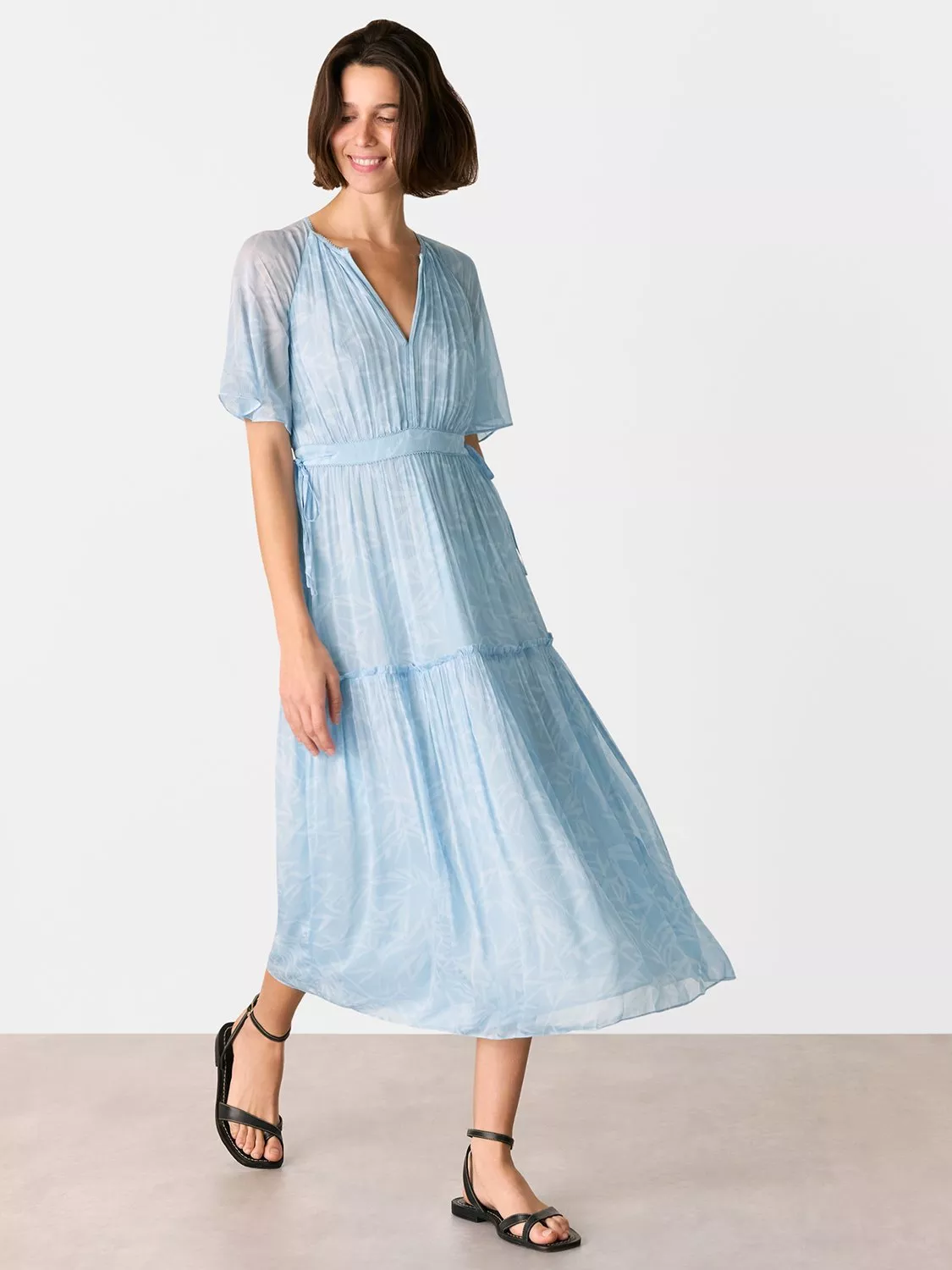 Creating a fluid feel in a tiered silhouette, this gathered midi dress from Whistles is made from viscose that's beloved for its weightless feel. With a flattering v-neckline and short sleeves, this style is printed with a bamboo leaf inspired design.