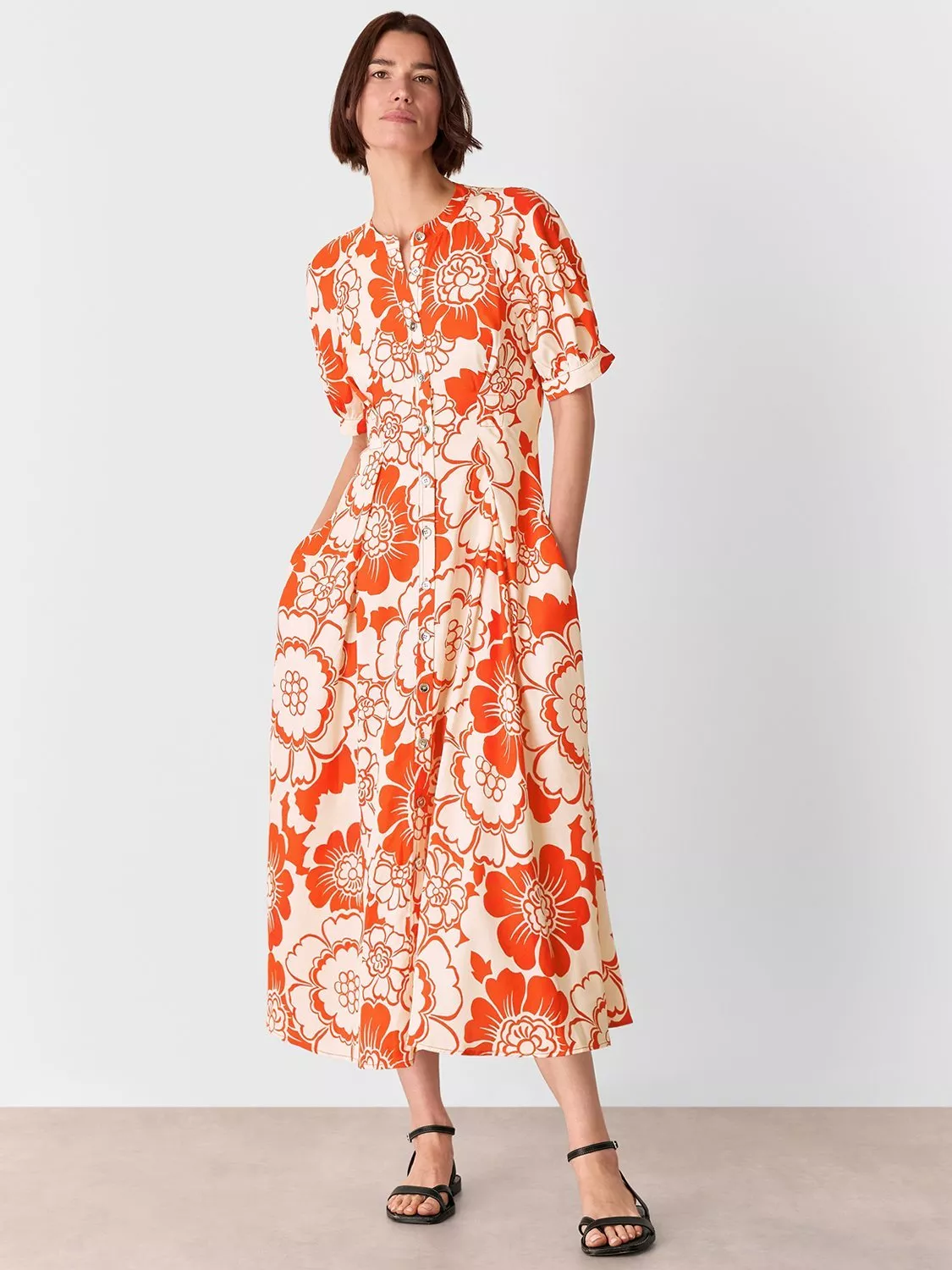 Let the Whistles Bloom Floral Midi Dress transport you to sun-drenched gardens. Its vibrant red and multi-coloured blooms dance across a flowing midi silhouette, while the gentle round neck adds a touch of sweetness. Crafted from a whisper-soft blend of sustainable LENZING ECOVERO viscose and viscose, it's the dress made for those long, lazy summer days.