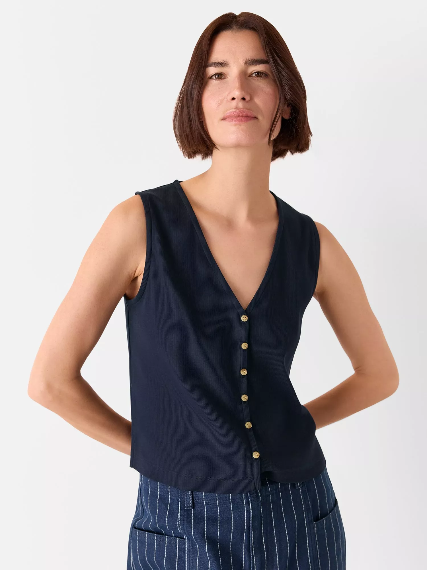 Simple and versatile in nature, this button rib tank top by Whistles features a flattering v-neckline and offers a soft feel thanks to its cotton blend.