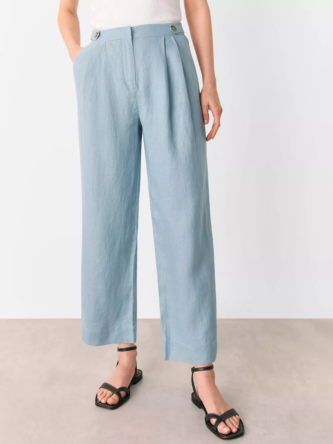 Imagine sun-drenched afternoons in these Whistles’ pale blue ankle grazers. Tailored with a touch of ease and crafted from 100% linen, offering a breezy, casual elegance. The subtle, soft hue and flattering ankle-grazing cut make them a charming addition to your warm-weather wardrobe, promising both comfort and effortless style.