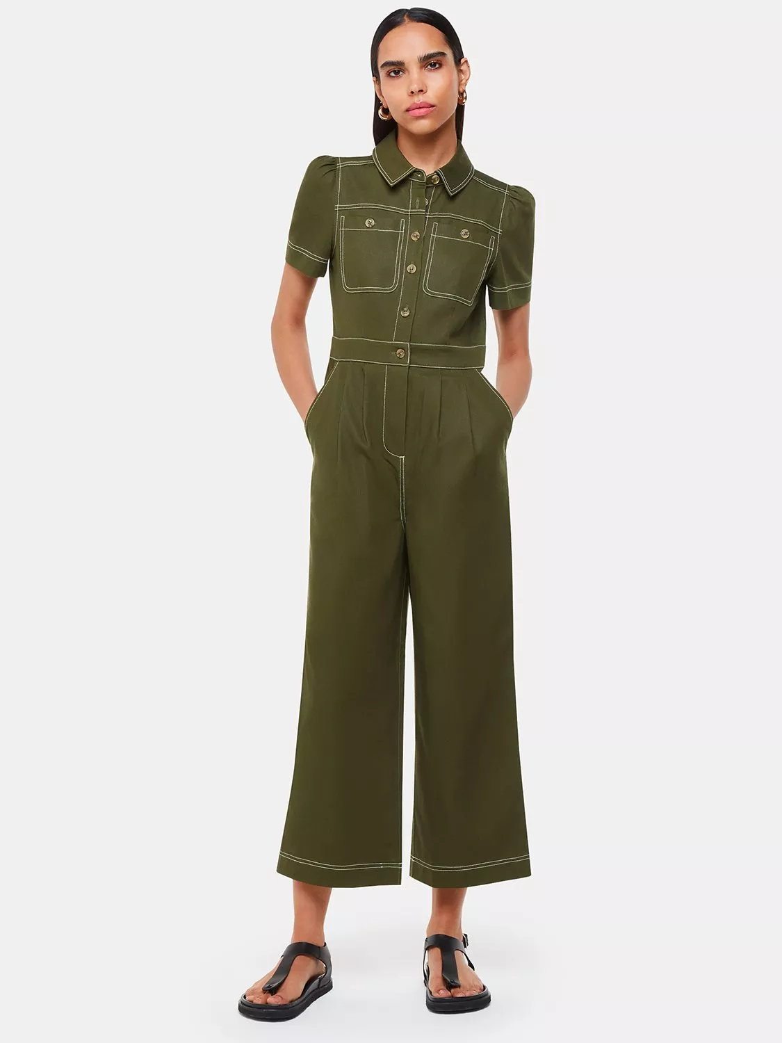 Smartened with a collar neckline and short sleeves, this utility jumpsuit from Whistles falls to a flattering wide leg silhouette. Blended with contrast stitched cotton for a supremely soft handle, it's an easy option for casual days about town.
