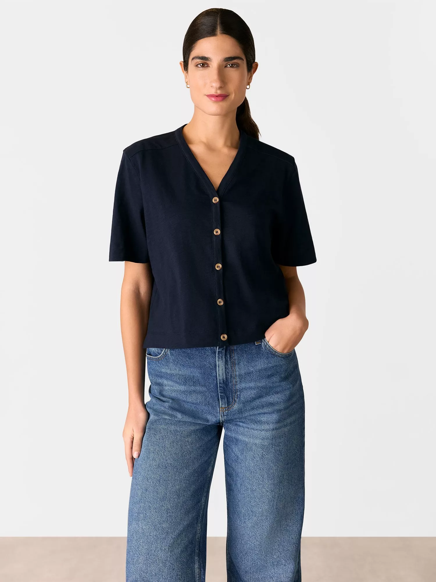A solo piece or layering staple, this button-through top by Whistles is plain for easy mixing and matching. Framed with a v-neckline and short sleeves, it's made from soft and breathable cotton.
