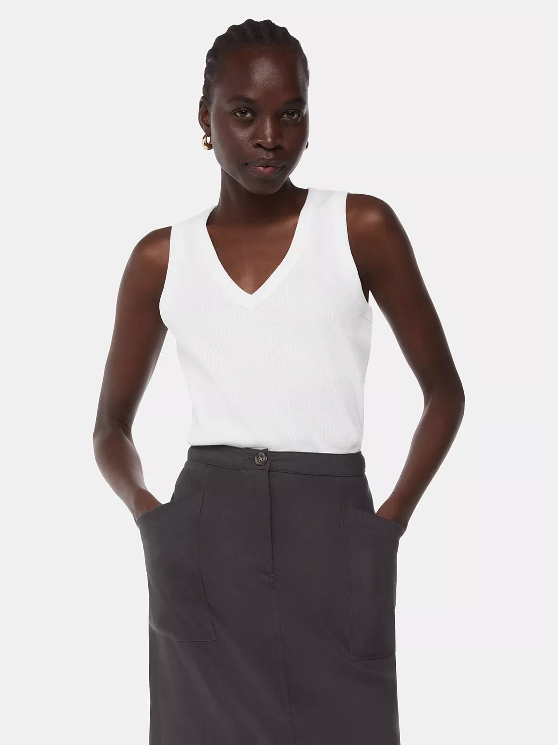 Classic in cut with a v-neckline and a sleeveless design, it is made from a comfortable cotton-rich fabric and is ideal when partnered with floaty midi skirts for summer days spent strolling around the city.