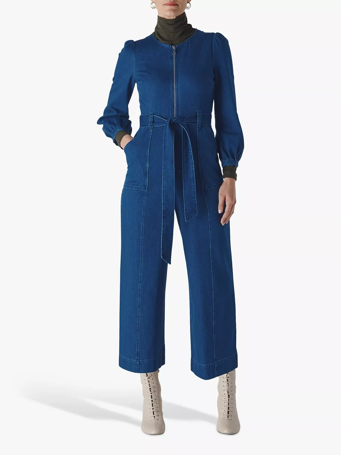 Reminiscing 70s style, designers at Whistles clearly had something to do with the Estelle. Known and loved for their sculpting denim, this zip-front jumpsuit has retro wide legs, puffy sleeves and comes with a knotted belt at the waist to cinch the frame. Visible stitching accents add hints of athleisure and utility into the mix, leaving the styling options wide open. So what will it be? Leather boots, trainers or mules?