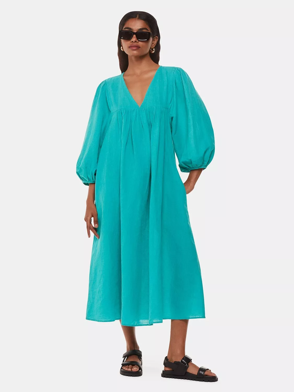 Easy to slip on and go in an breezy silhouette, this mid-length dress from Whistles offers a breathable and light fit thanks to its linen blended construction. Effortlessly flattering thanks to a fuss-free v-neckline and puffy three-quarter sleeves, it is kept trend-free so that it'll sit in your closet for years to come.
