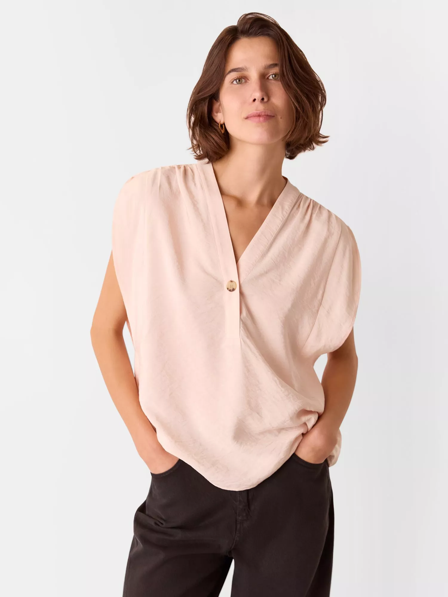 In a relaxed silhouette that they're known for, this blouse from Whistles allows for endless styling opportunities. With a v-neckline and cap sleeves, it is made from a light and breezy blended fabric.