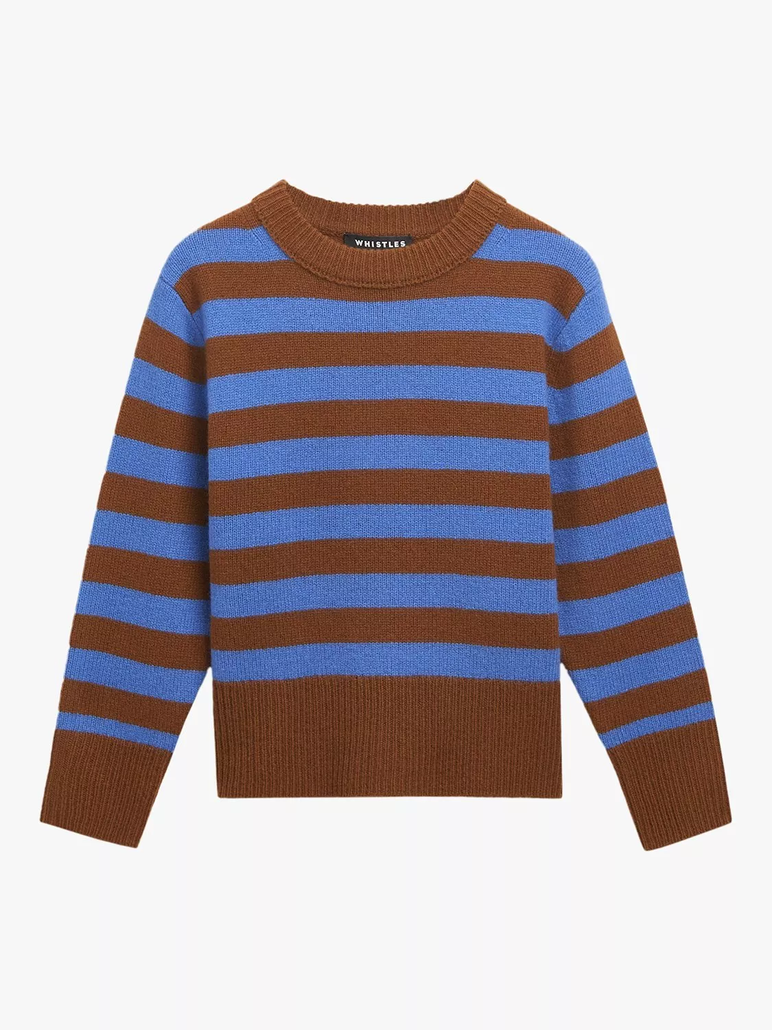 In pure wool for a toasty finish, Whistles' knit jumper is great for those chillier days. Decorated in classic stripes with ribbed trims and a split hem, it looks great with jeans, boots and their favourite beanie hat.