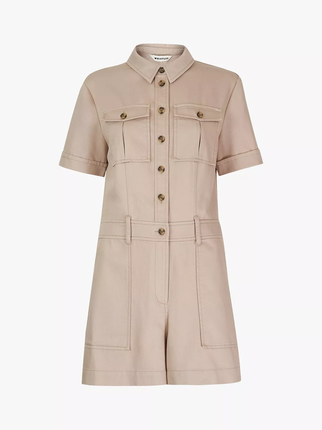 Providing a staple for smart-casual dressing, this jumpsuit by Whistles is a simple throw on and go style. Smartening your look with its collared neckline and short sleeves, the cotton blend fabric is woven with a twill weave making it durable but soft. Distinct utility details such as the flap pockets and belt make it perfect for relaxed days so dress it down with plimsolls or add heels for a little polish.