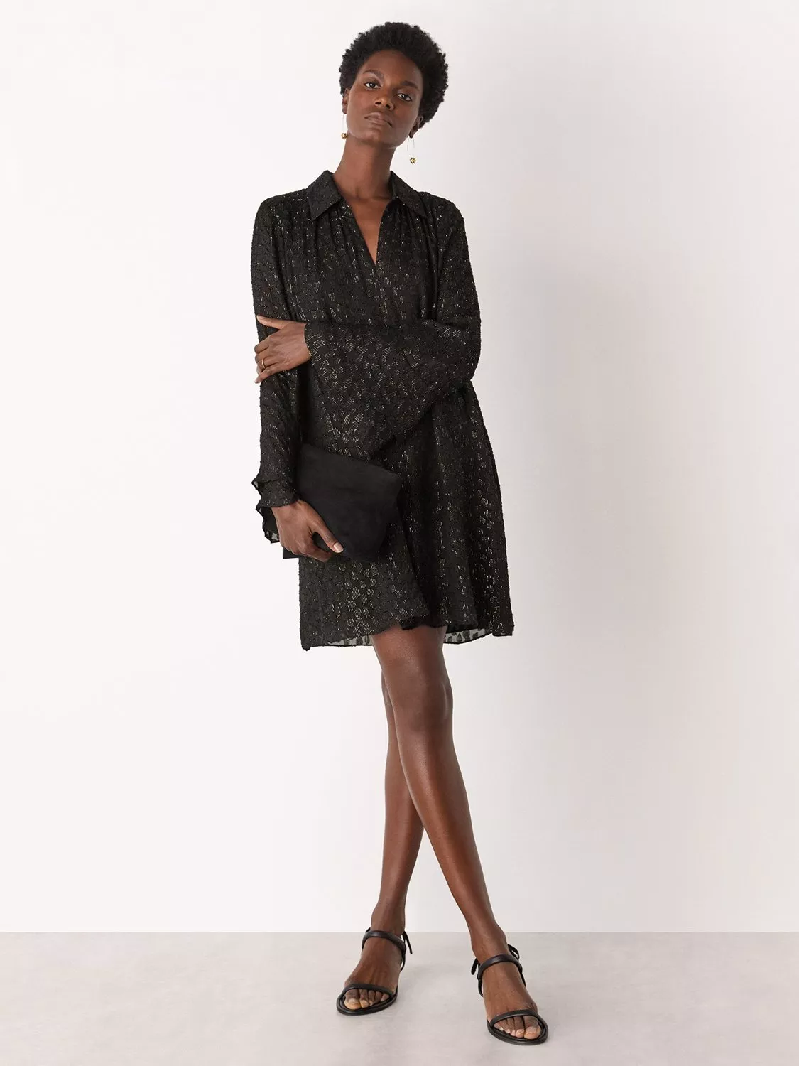 This mini dress catches the light with a metallic dobby geometric finish, offering a striking look for your next party. The straight fit and V-neck let you move comfortably, while long sleeves add a contemporary touch to your evening style.