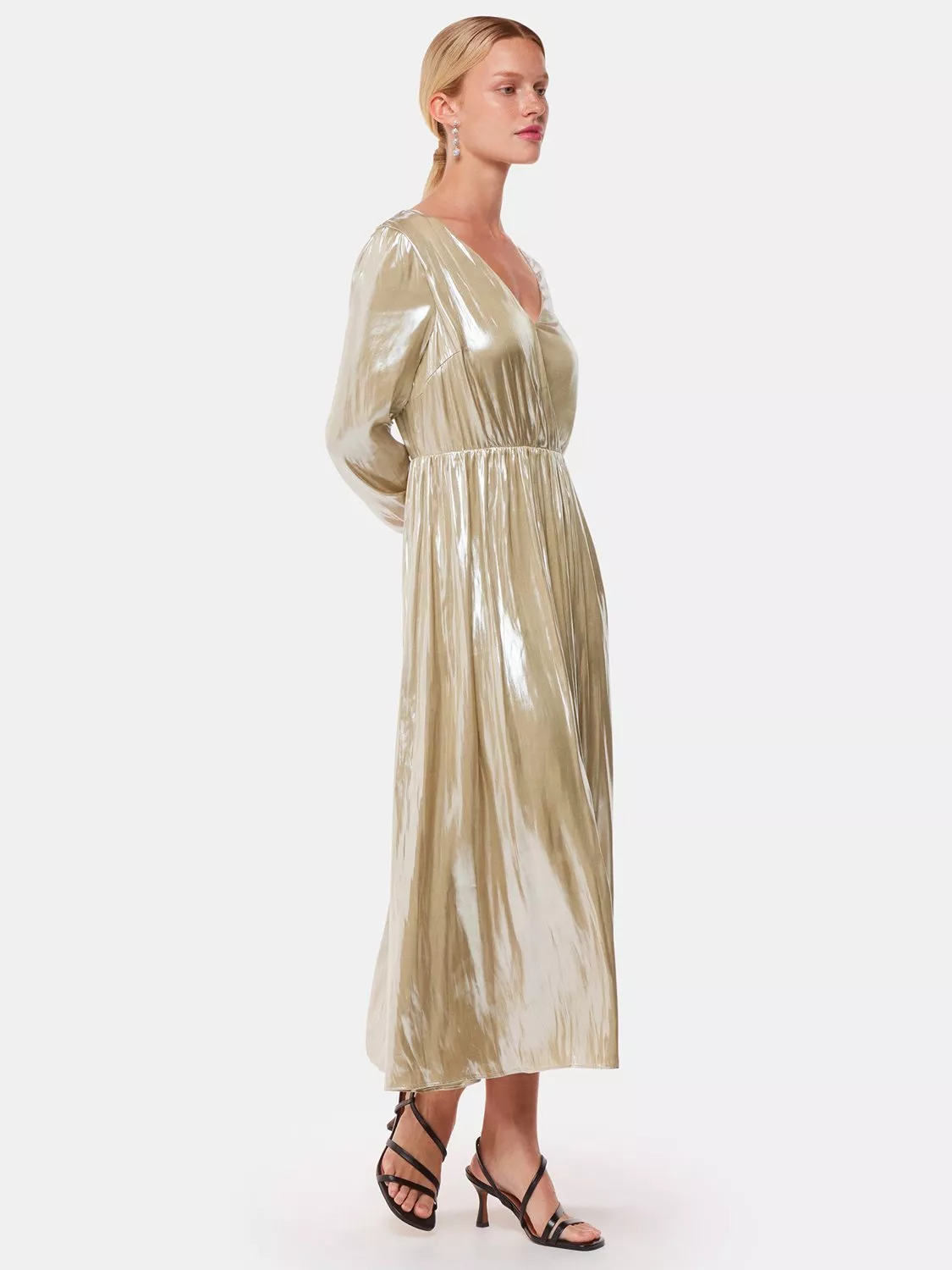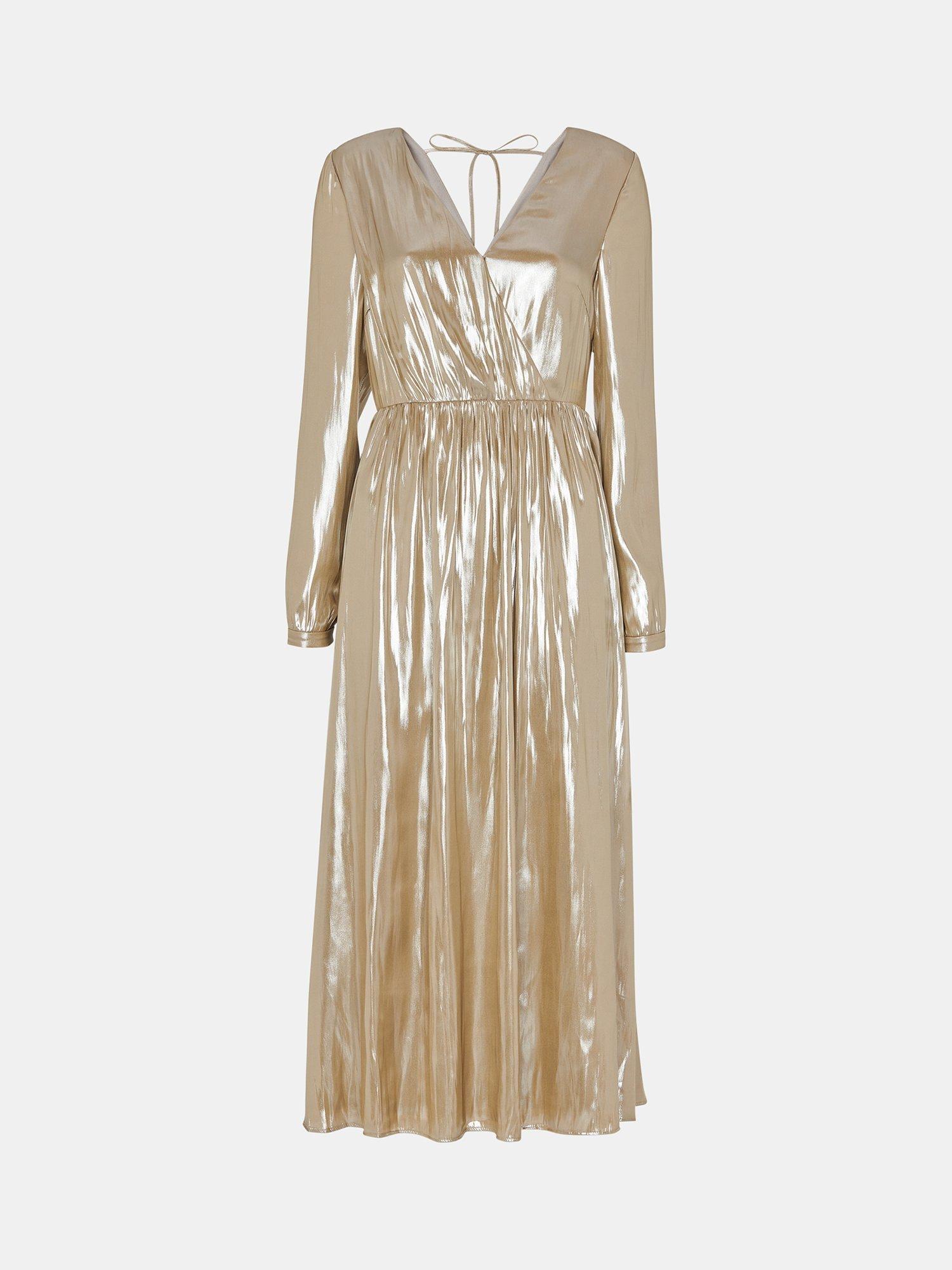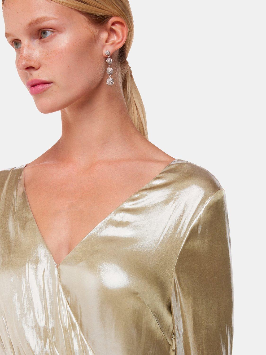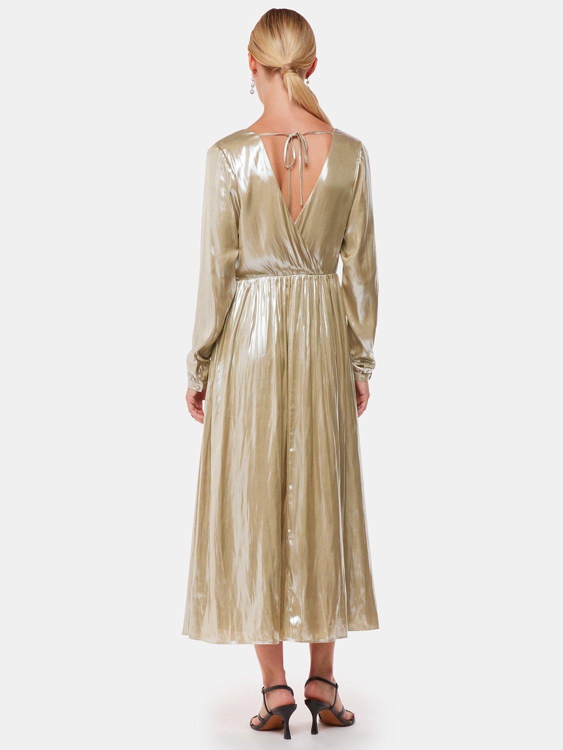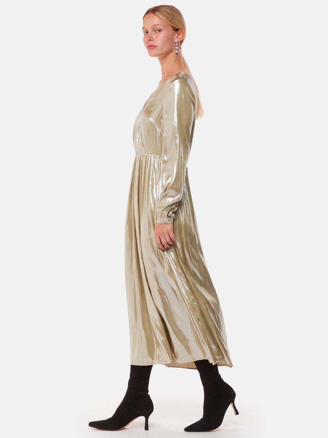 In a fit and flared style with a flattering wrap over front, this midi dress from Whistles is designed with a v-neck, full-length sleeves and a shimmery metallic fabric.