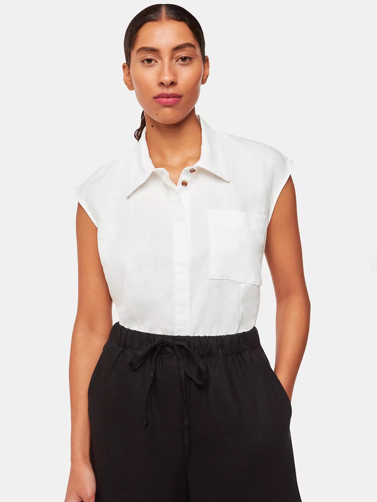 Designed with a crisp collar neckline and cap sleeves, it is made from linen for quality comfort in warmer weather and is ideal for relaxed daytime wear.