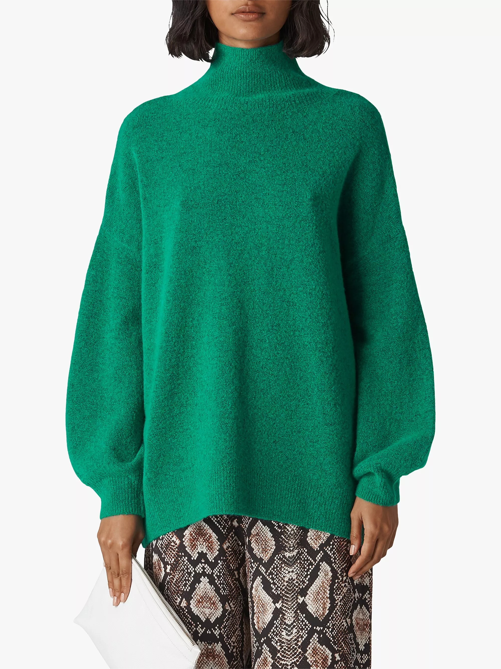 This design is spun from a soft wool blend in a feminine hue. It has an oversized silhouette and a cosy funnel neckline, making it easy to layer on particularly cold days. Wear with signature jeans and western boots during the week, or trainers and a modern backpack on weekends.