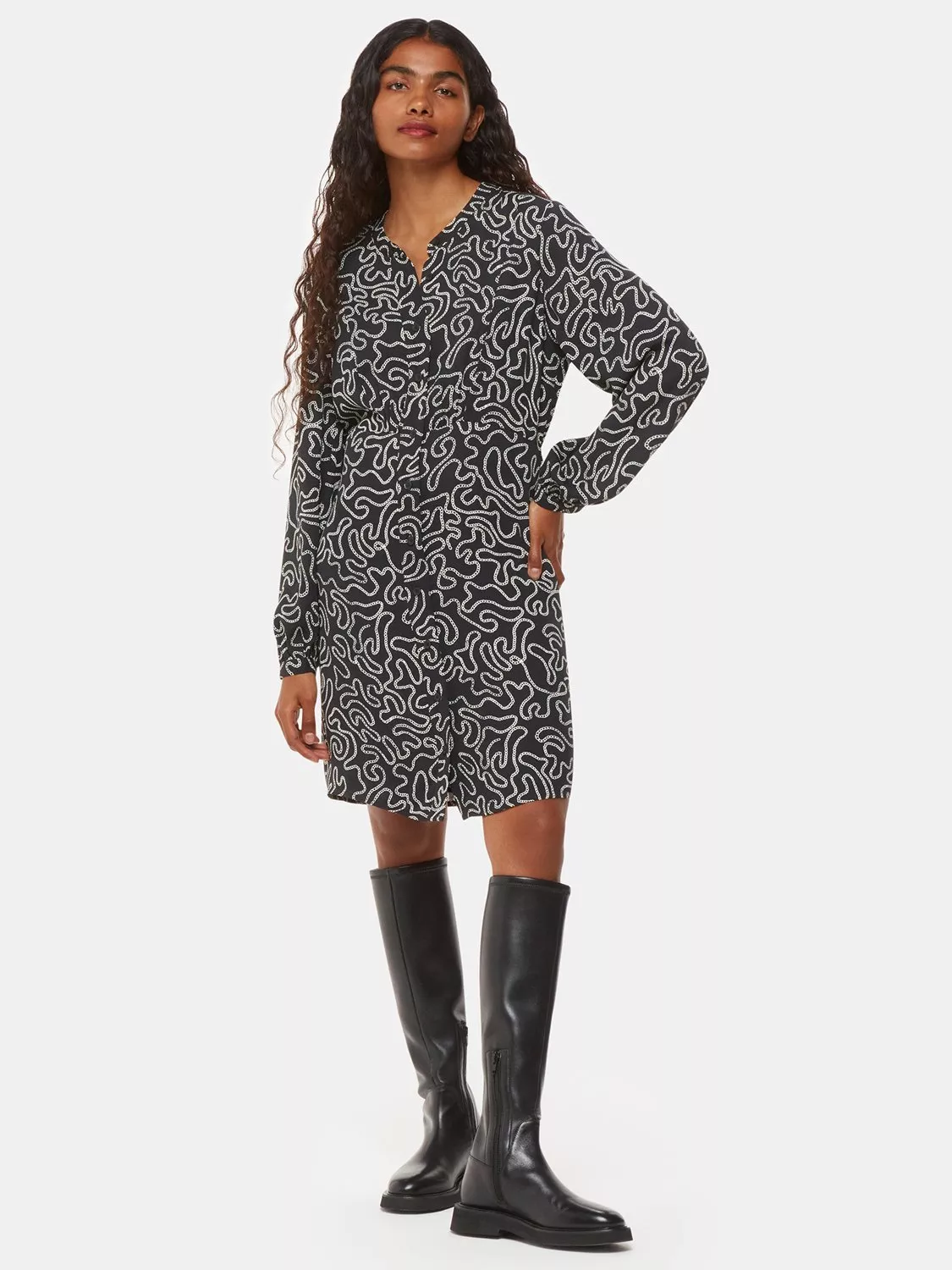 In a fuss-free tunic style, this petite mini dress from Whistles is dreamt up from whisper-weight viscose. Topped with a round neck, long sleeves and a button front, it is doused in an all-over chain print.