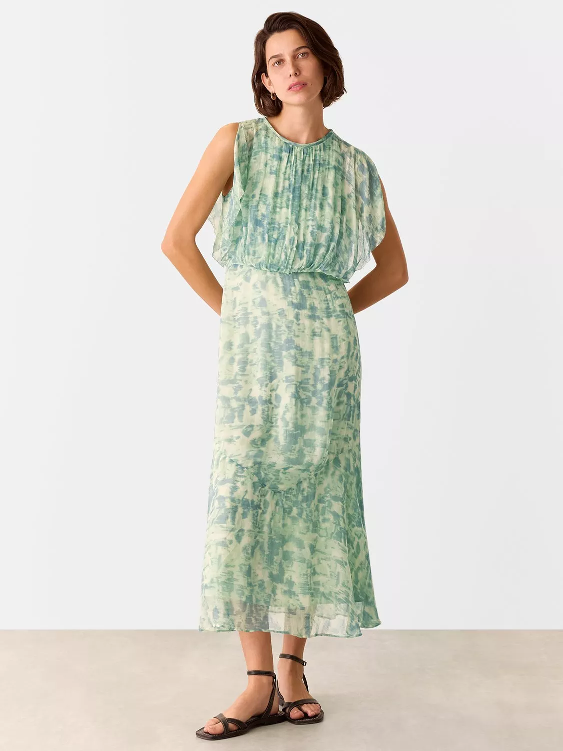 Exaggerating your silhouette in a fit and flare shape, this petite midi dress from Whistles is a stunning events style. Made from liquid-like viscose with a chiffon layered bodice, it features a round neckline and an all-over dashed brushmark design.
