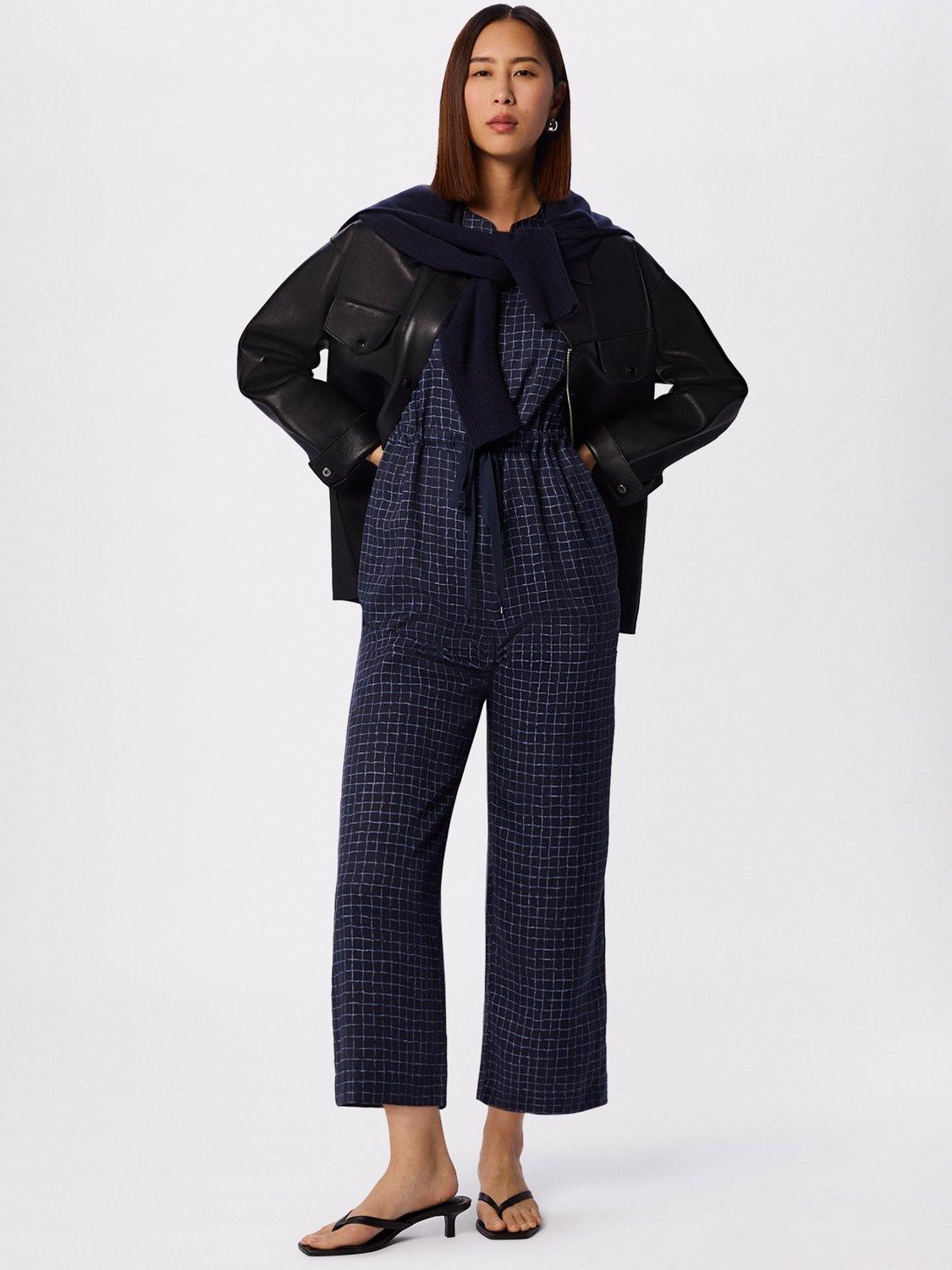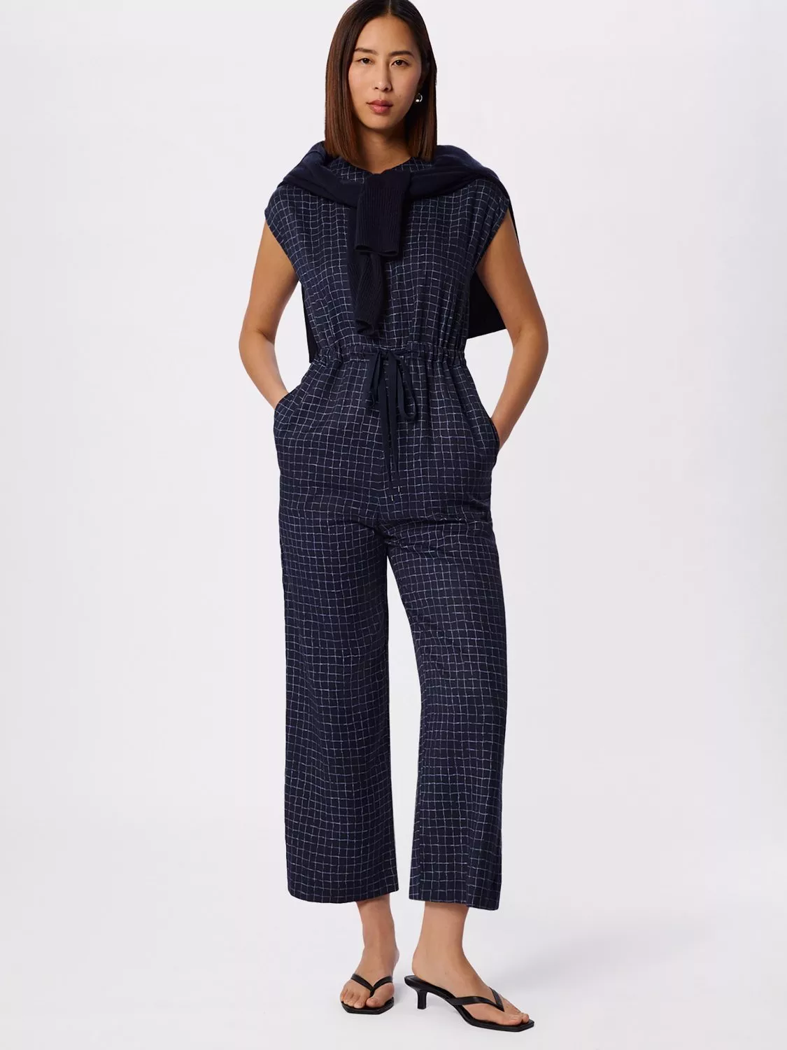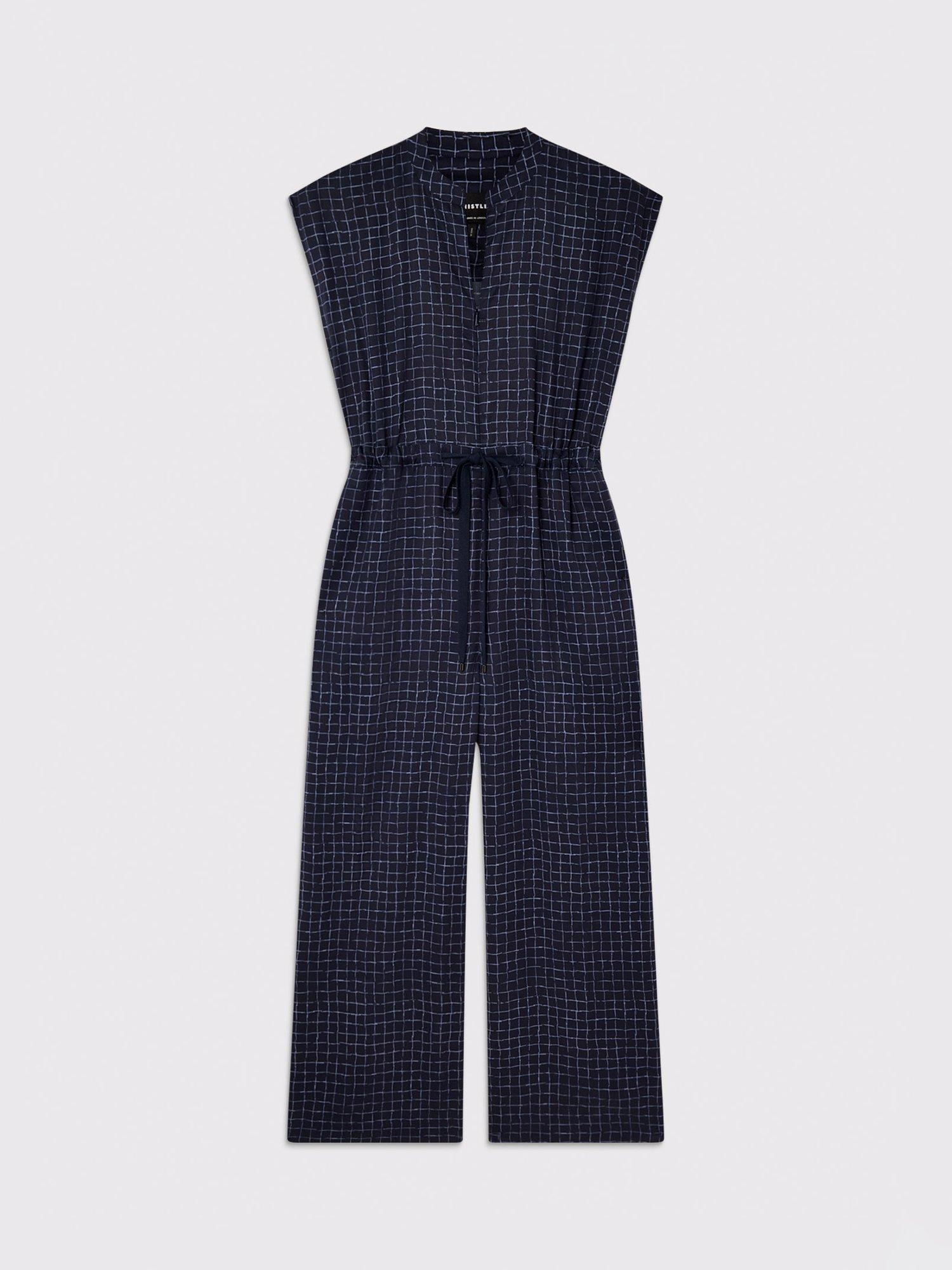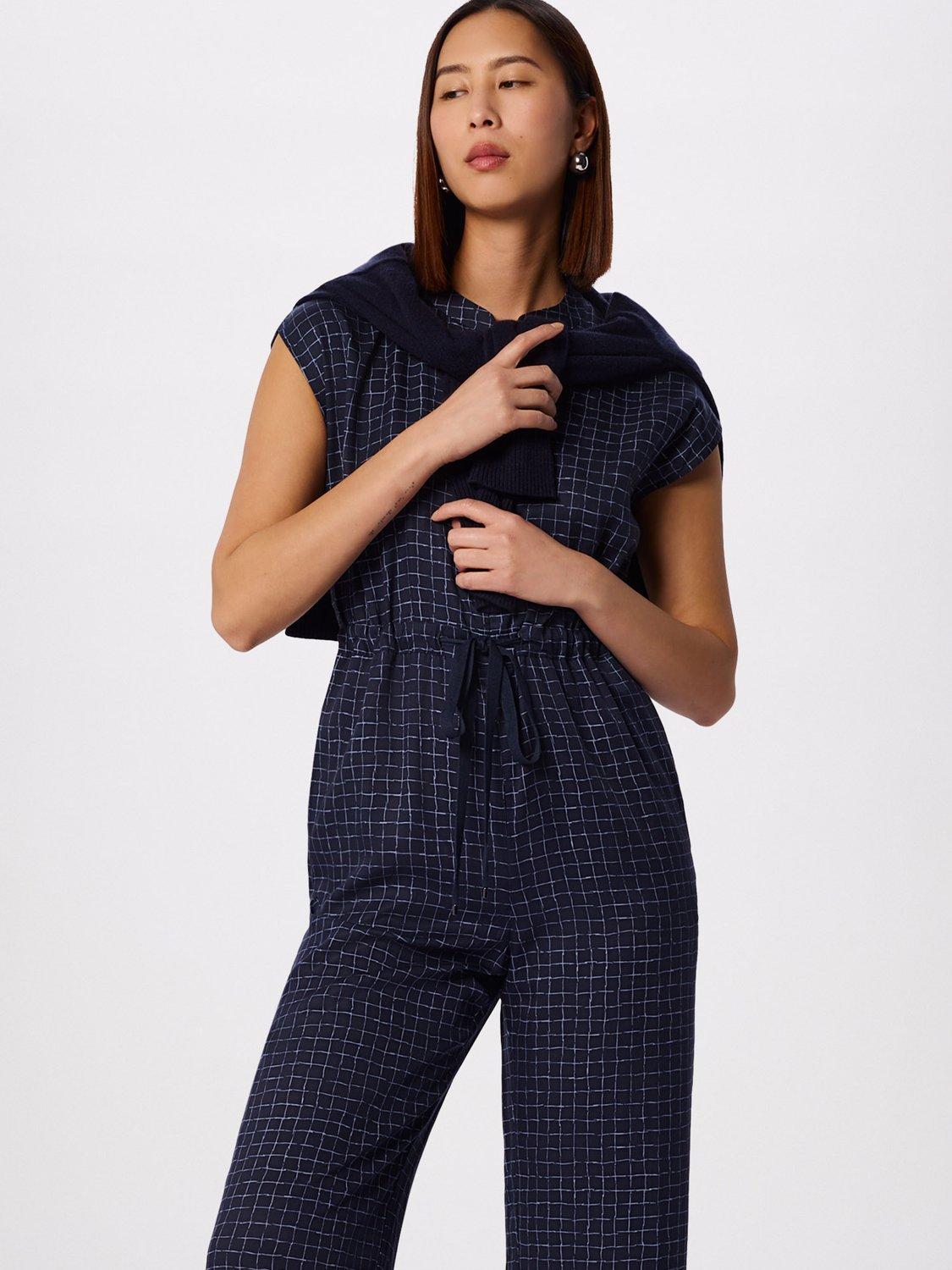 A sleeveless petite jumpsuit, designed with a flattering wide leg and V-neck. The grid check pattern adds a clever twist, while the drawstring waist lets to alter the shape.