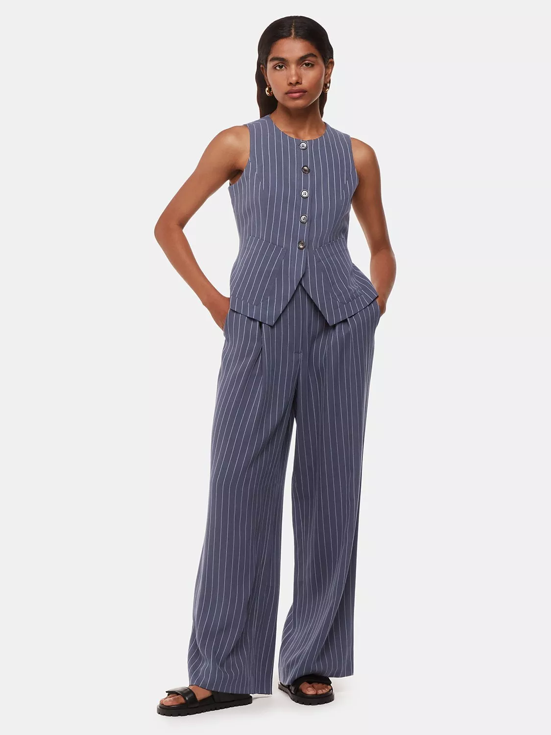 In classic stripes, this waistcoat from Whistles is made from a longlasting blended fabric. Wear with the coordinating trousers for the ultimate look.