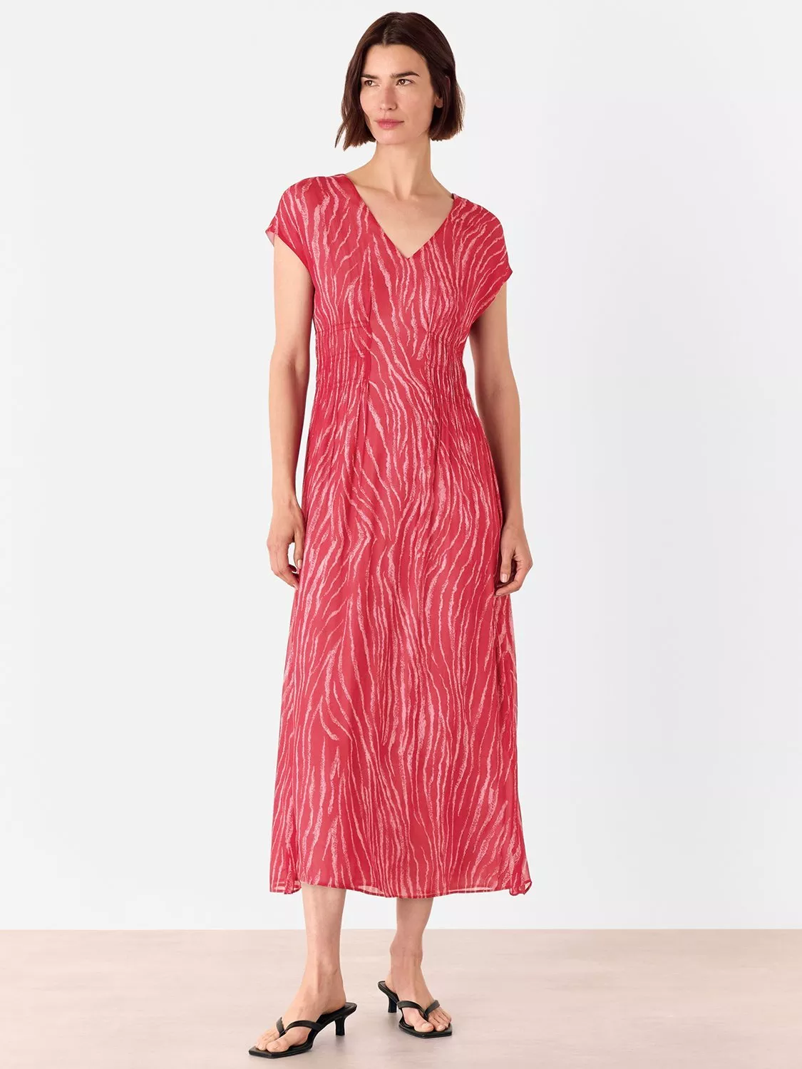 Constructed with a nipped in waist and flared hem, this petite mid-length dress from Whistles is made from lightweight viscose. Effortlessly flattering thanks to a fuss-free v-neckline and cap sleeves, it is planted with zebra stripes.