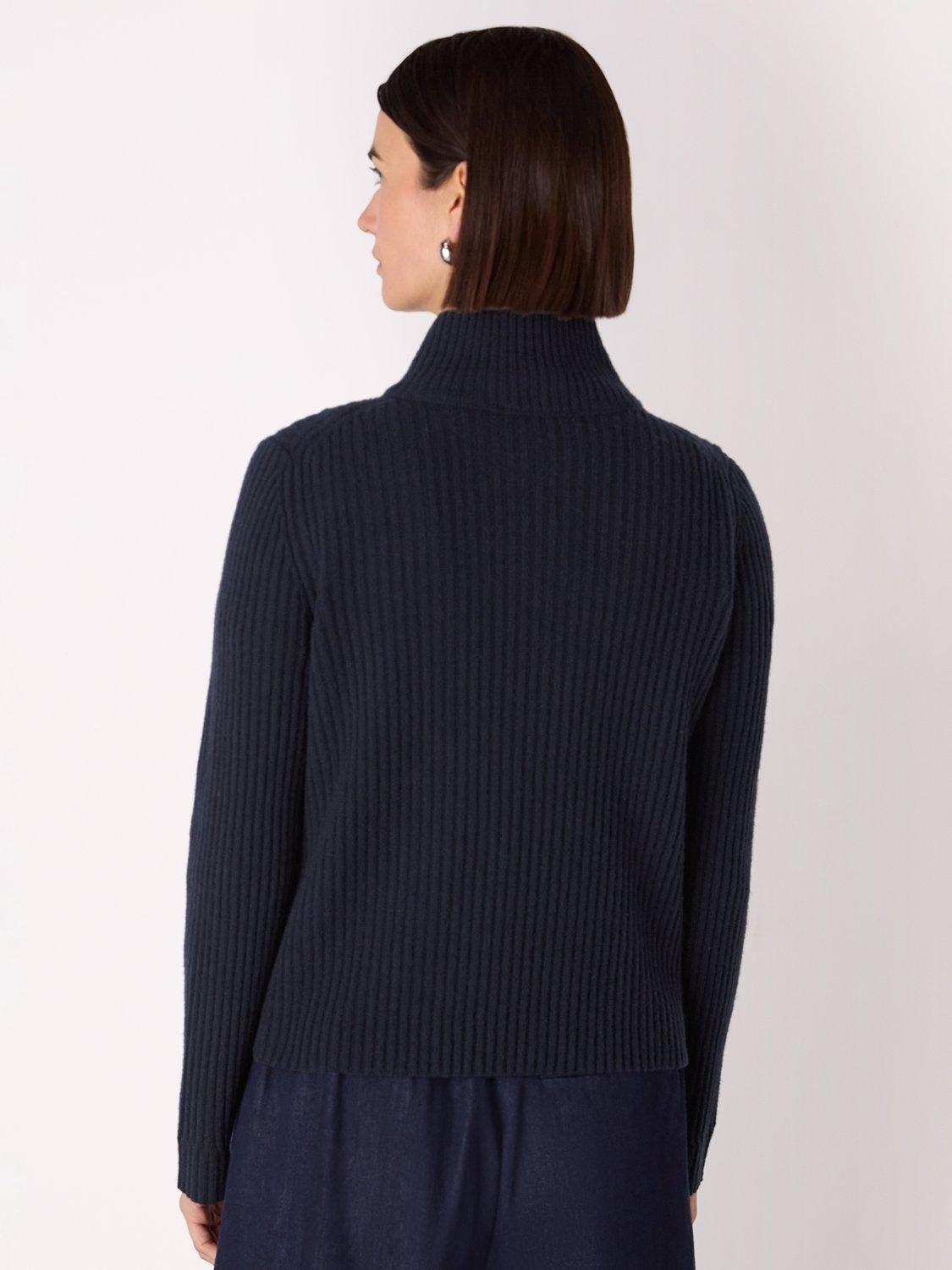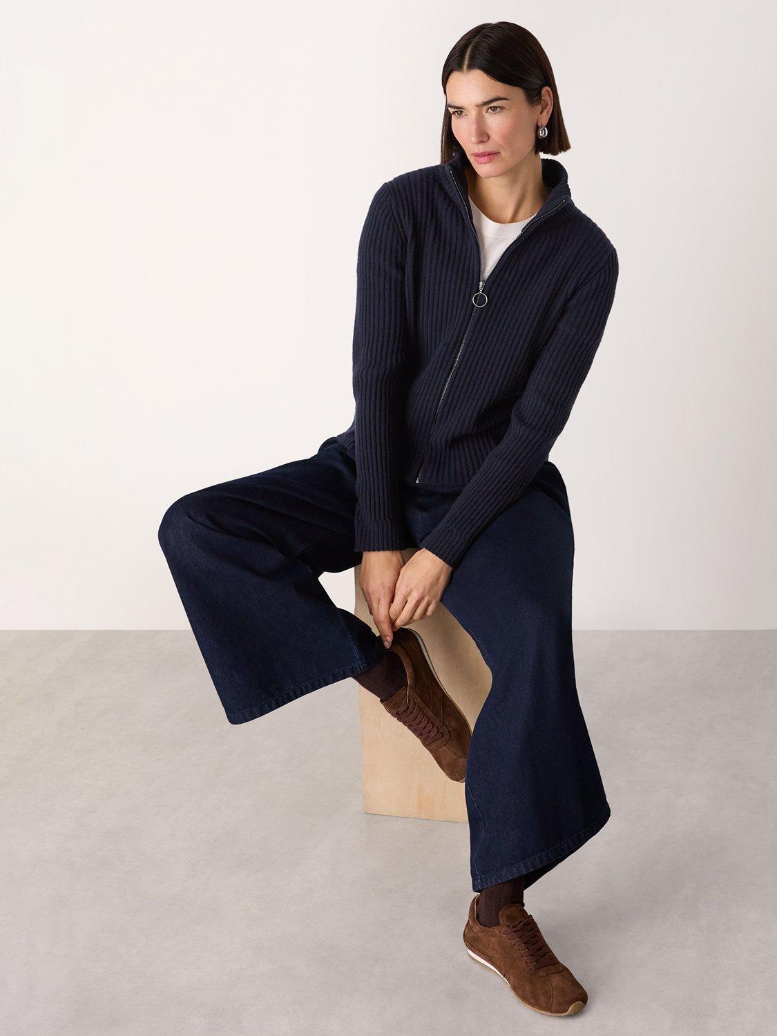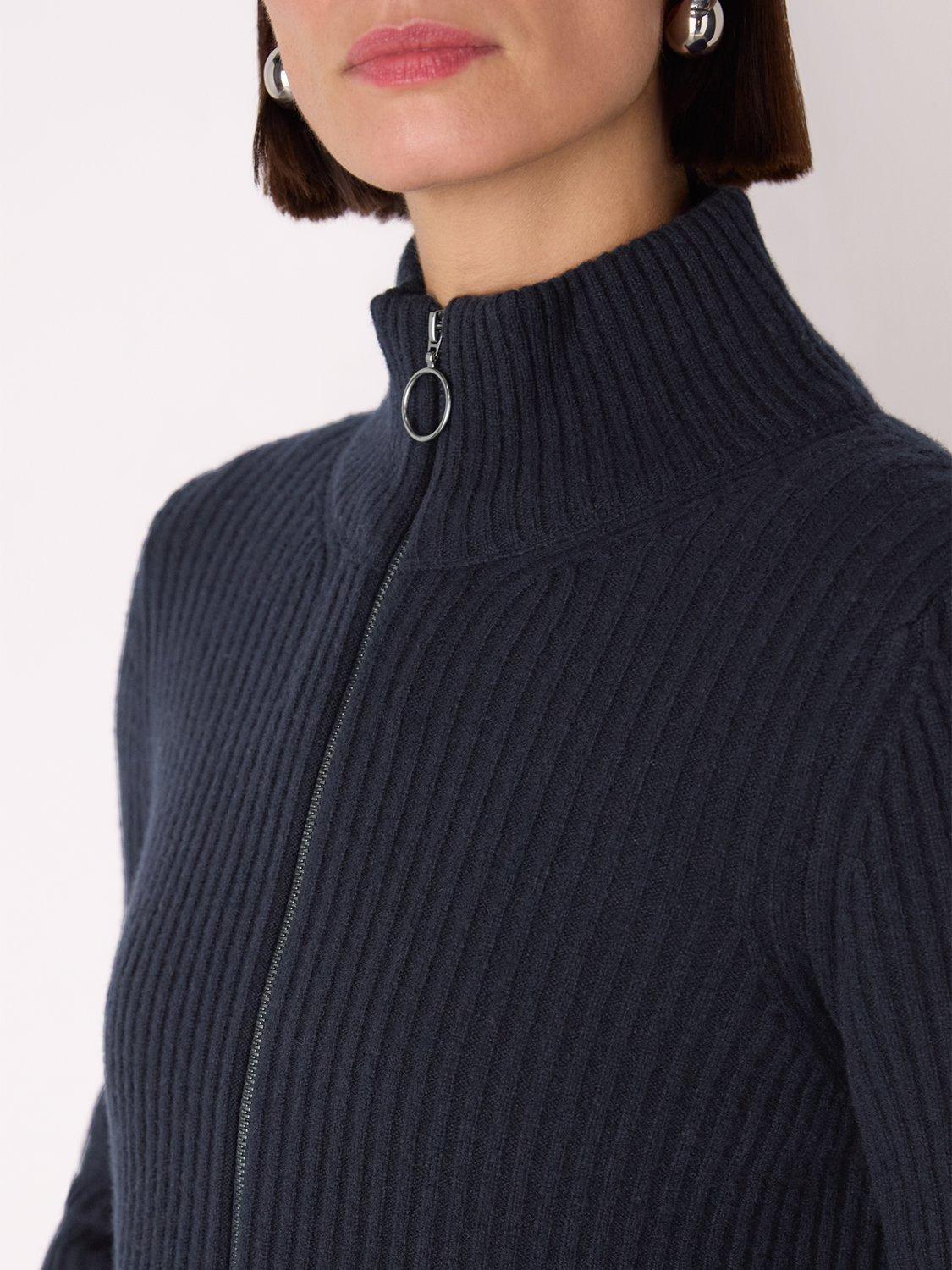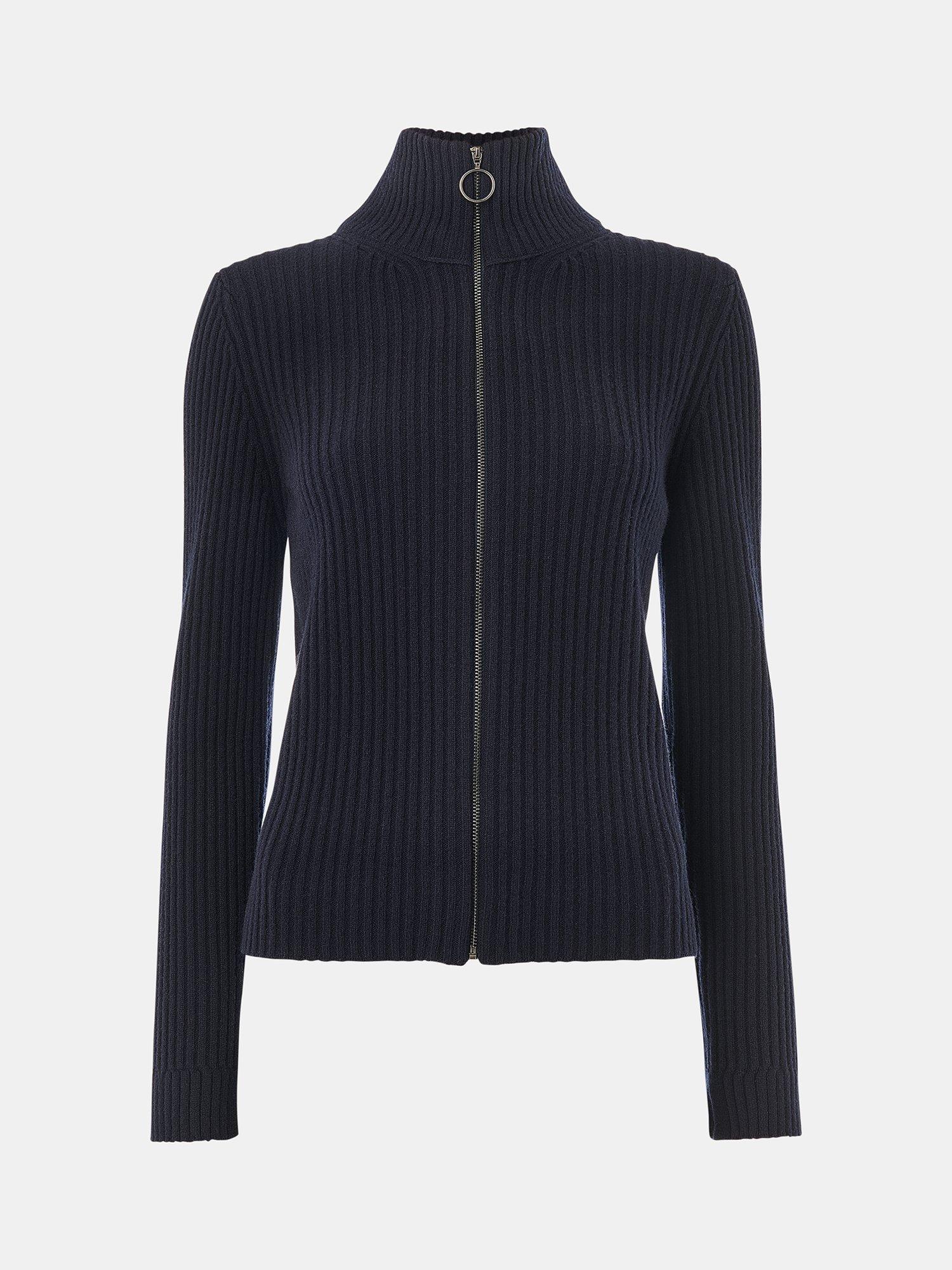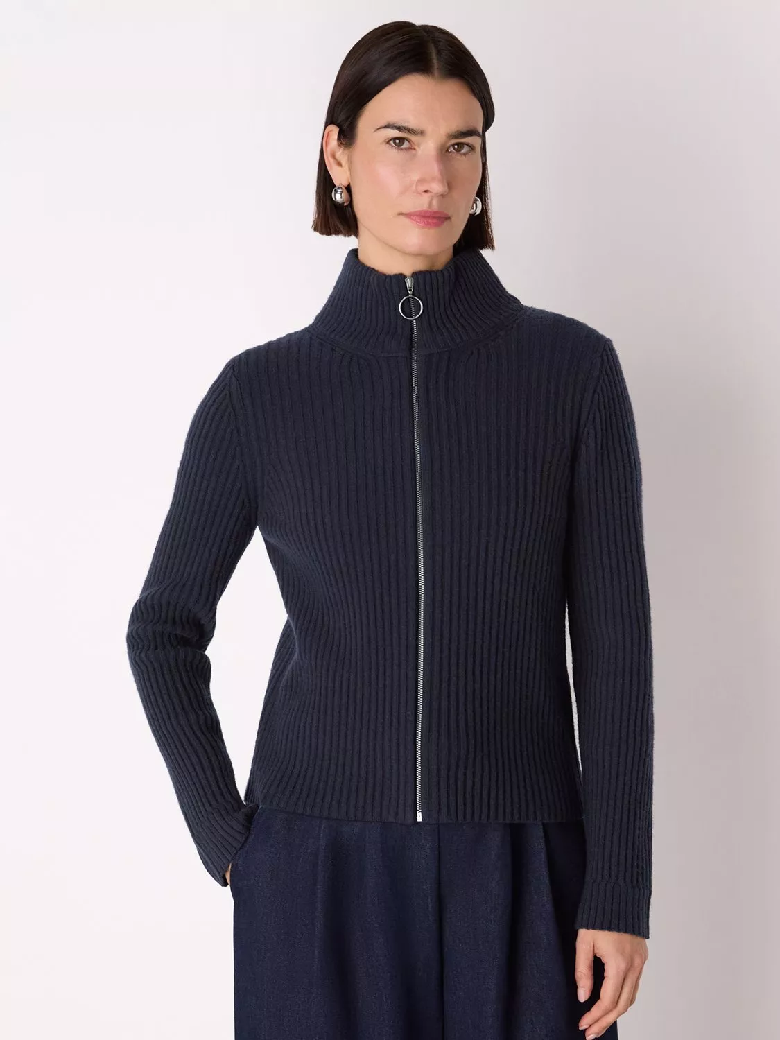 A soft, high-neck pure wool cardigan from Whistles. The textured ribbed knit adds interest while the zip fastening is perfect for layering in changing weather.