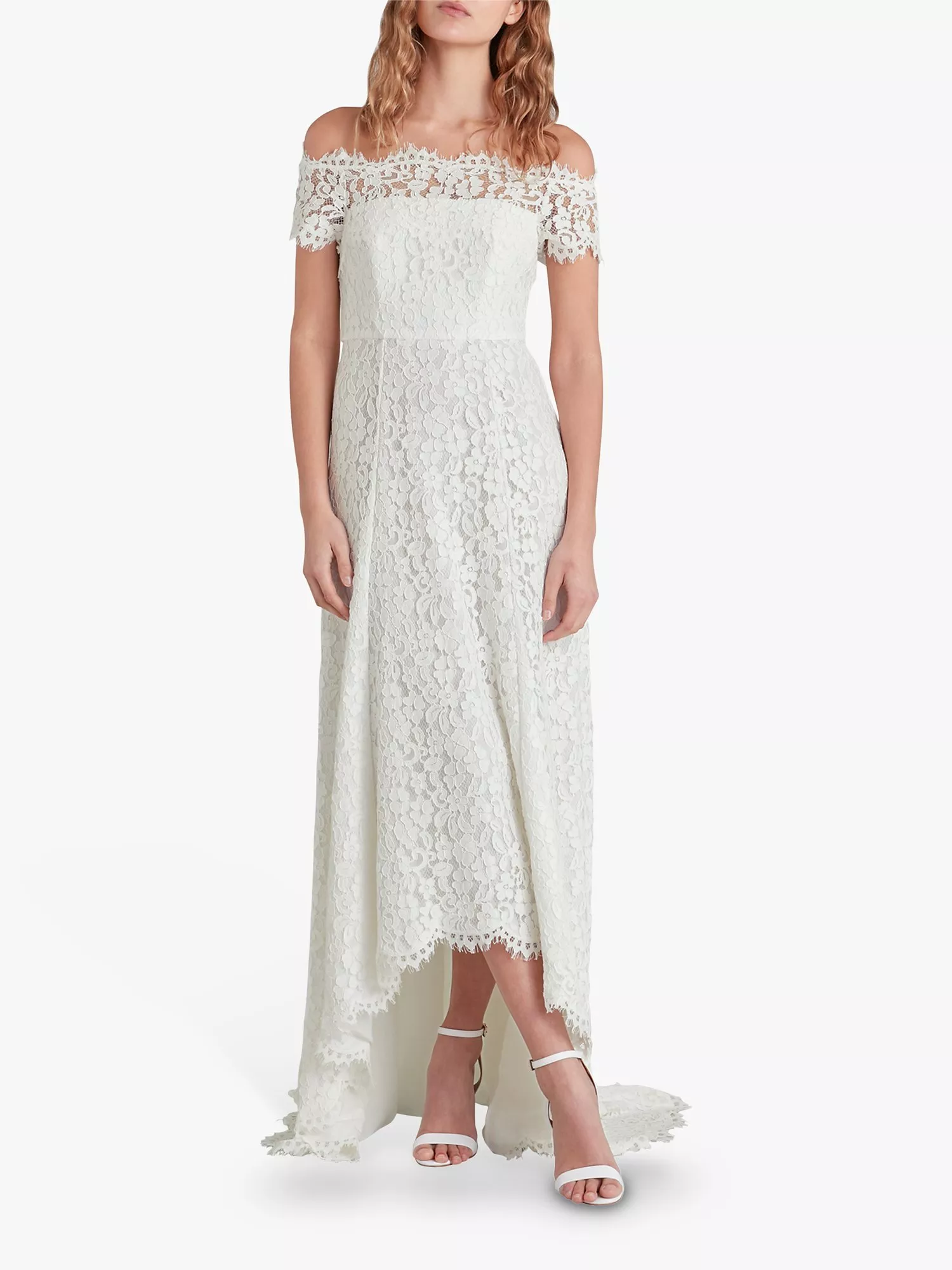 The gentle A-line silhouette lends simplicity, while the fine lace design adds a timeless appeal that will never go out of style. Details include an on-trend Bardot neckline, a raised front hem and a boned bodice.