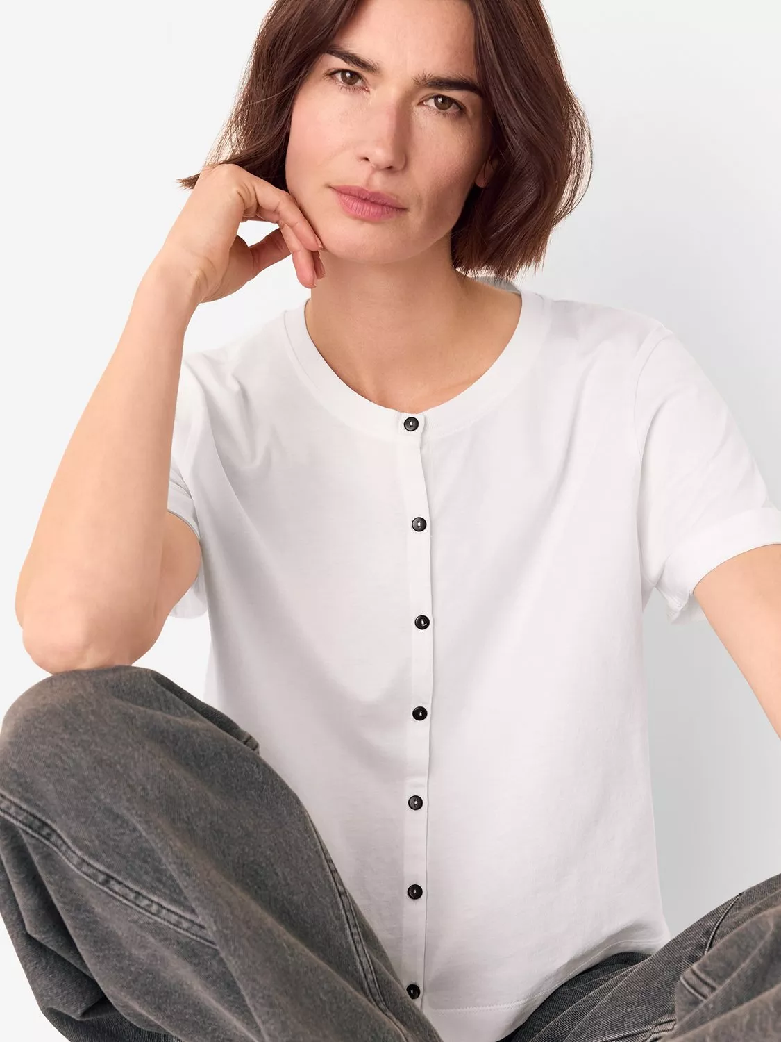 The foundation to all your looks, this button-up t-shirt from Whistles is made from soft cotton with a simple round neck.
