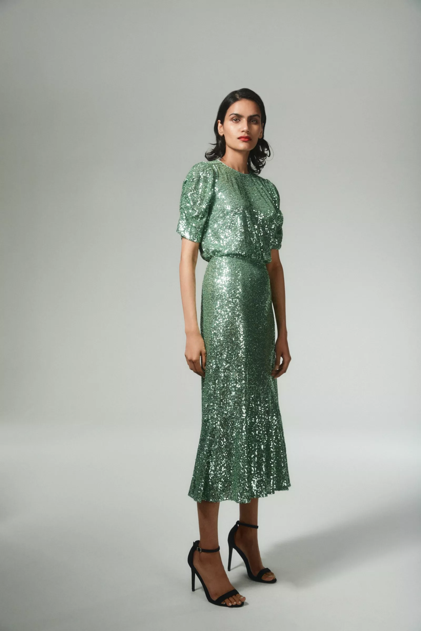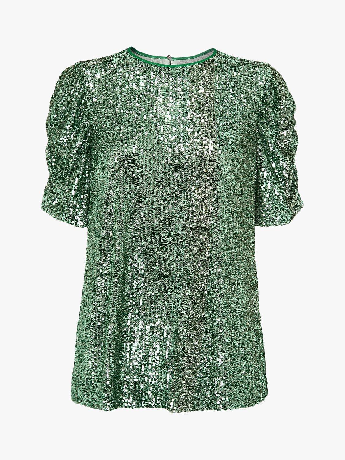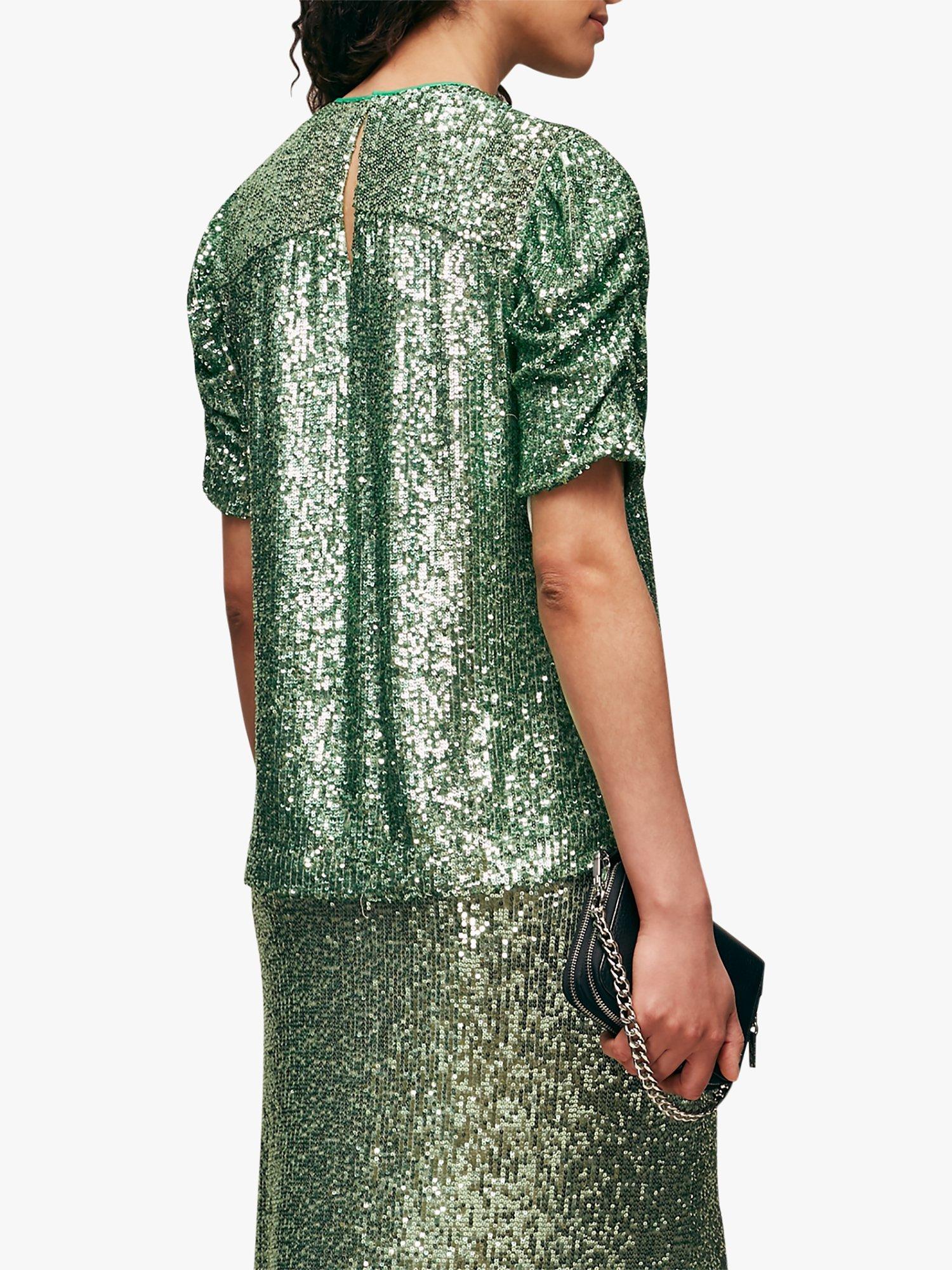 This top comes in a design that has been adorned in sequins, ready for party season. We especially love the puffed sleeves. Wear with leather or dress down denim this autumn-winter.