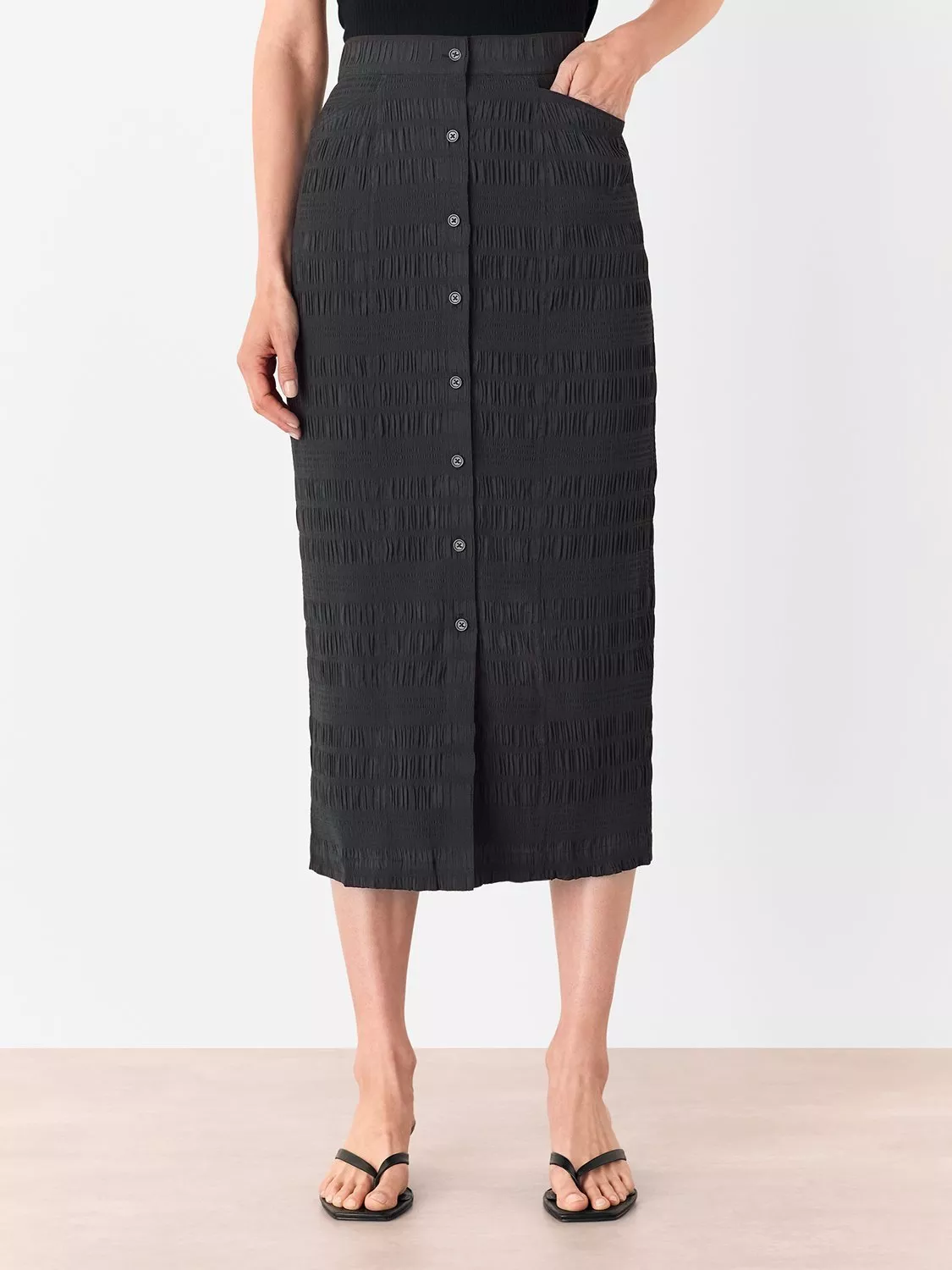 Straight in shape with buttons through the front, this calf-grazing skirt by Whistles is dreamt up from a plisse pleated viscose blend.