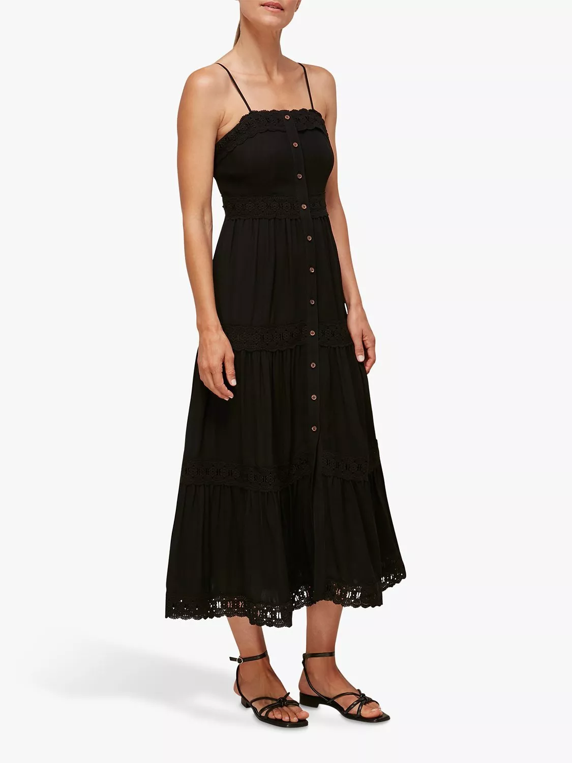 In a softly flared silhouette, this midi dress from Whistles offers a beautifully feminine look with embroidered lace. With a striking square neckline suspended from pin-thin straps, the buttons running through the front add that extra level of detail that takes it from part of your beachy holiday edit to dining out al a fresco style with friends.