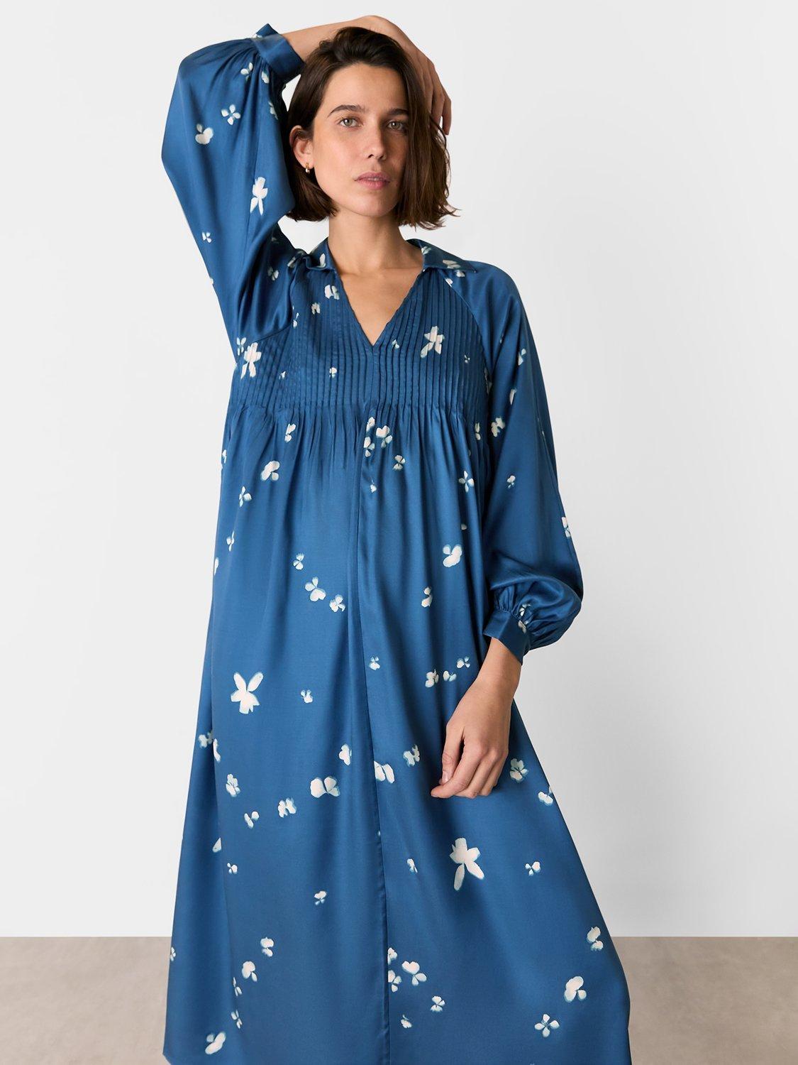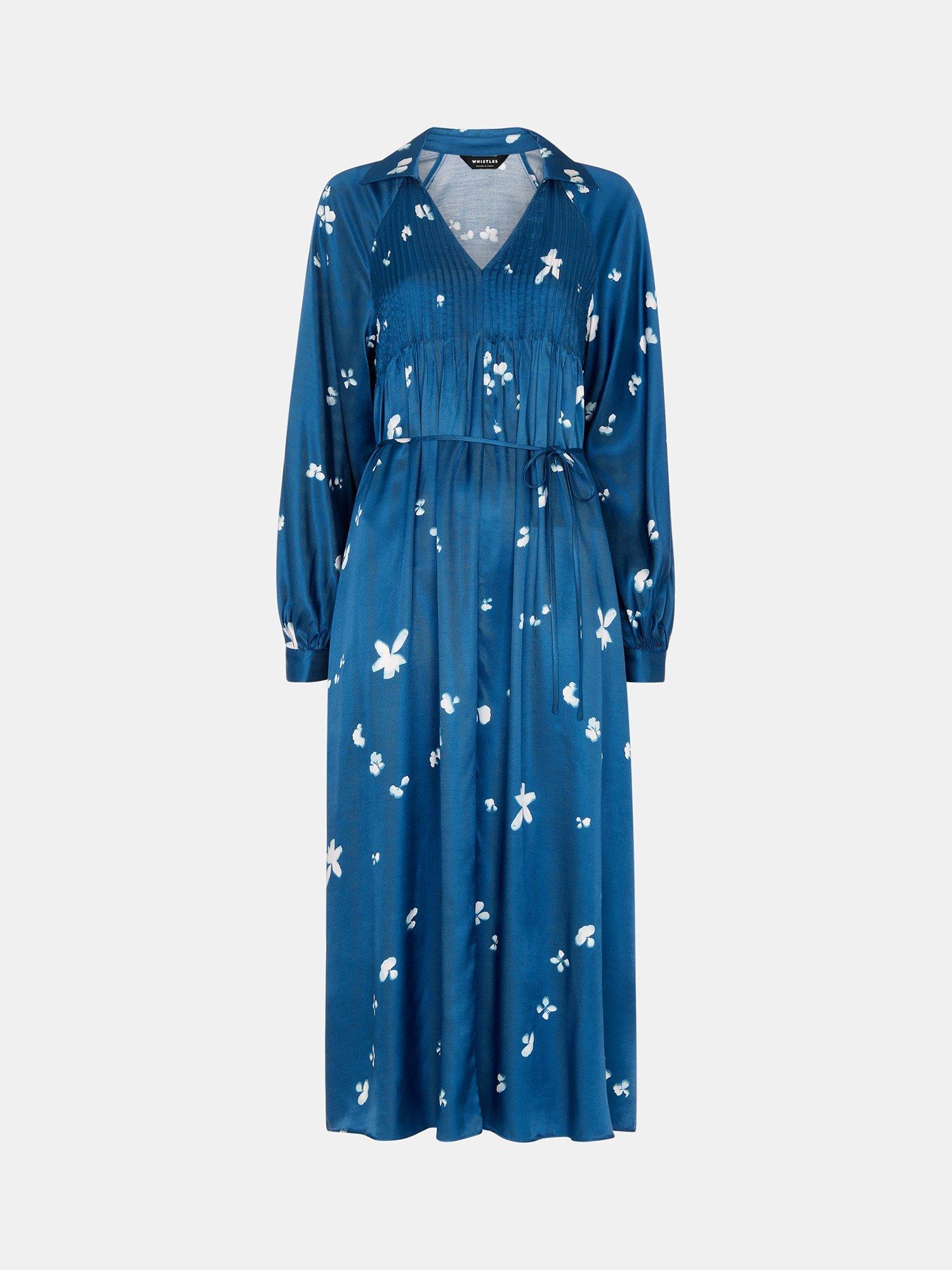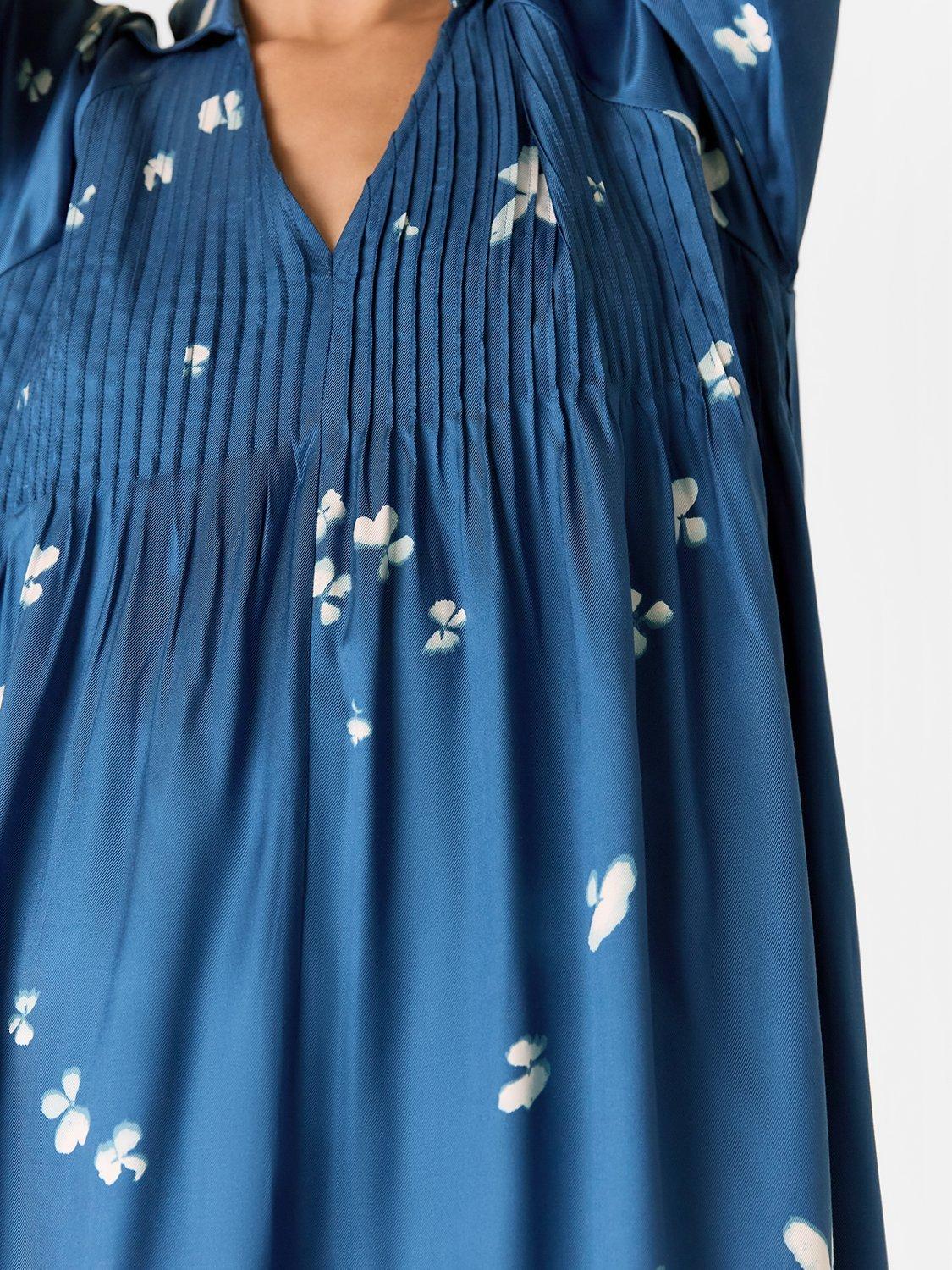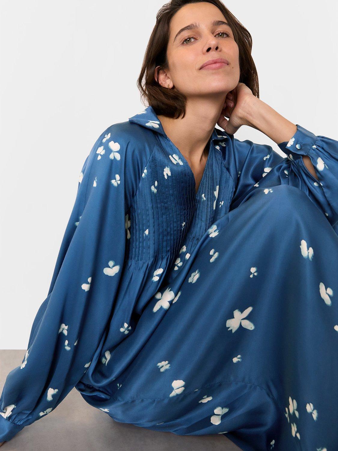 Designed in an easy to wear smock style, this dress from Whistles is made from a satin effect viscose with a weightless feel. With a collar v-neckline and long cuffed sleeves, it is illustrated with a subtle floral blooms print and pleated pintucking to the chest.