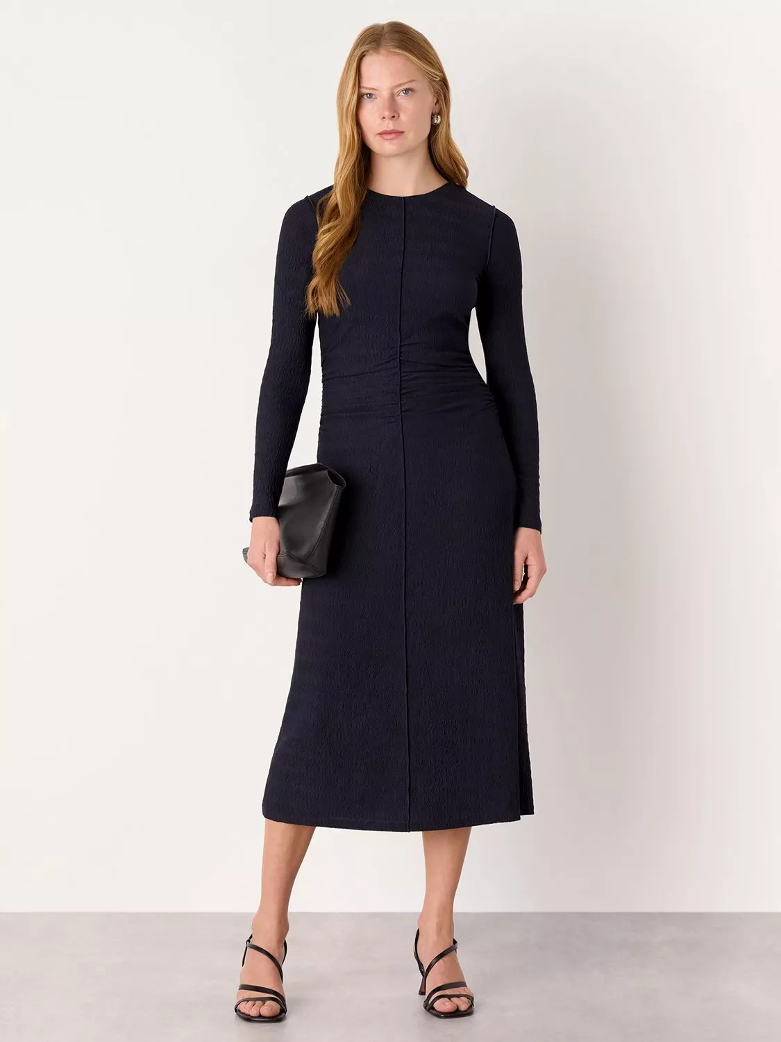 A textured jersey midi dress from Whistles. Its clever ruching flatters your shape while long sleeves and a round neck offer comfort. Perfect for your daytime plans.