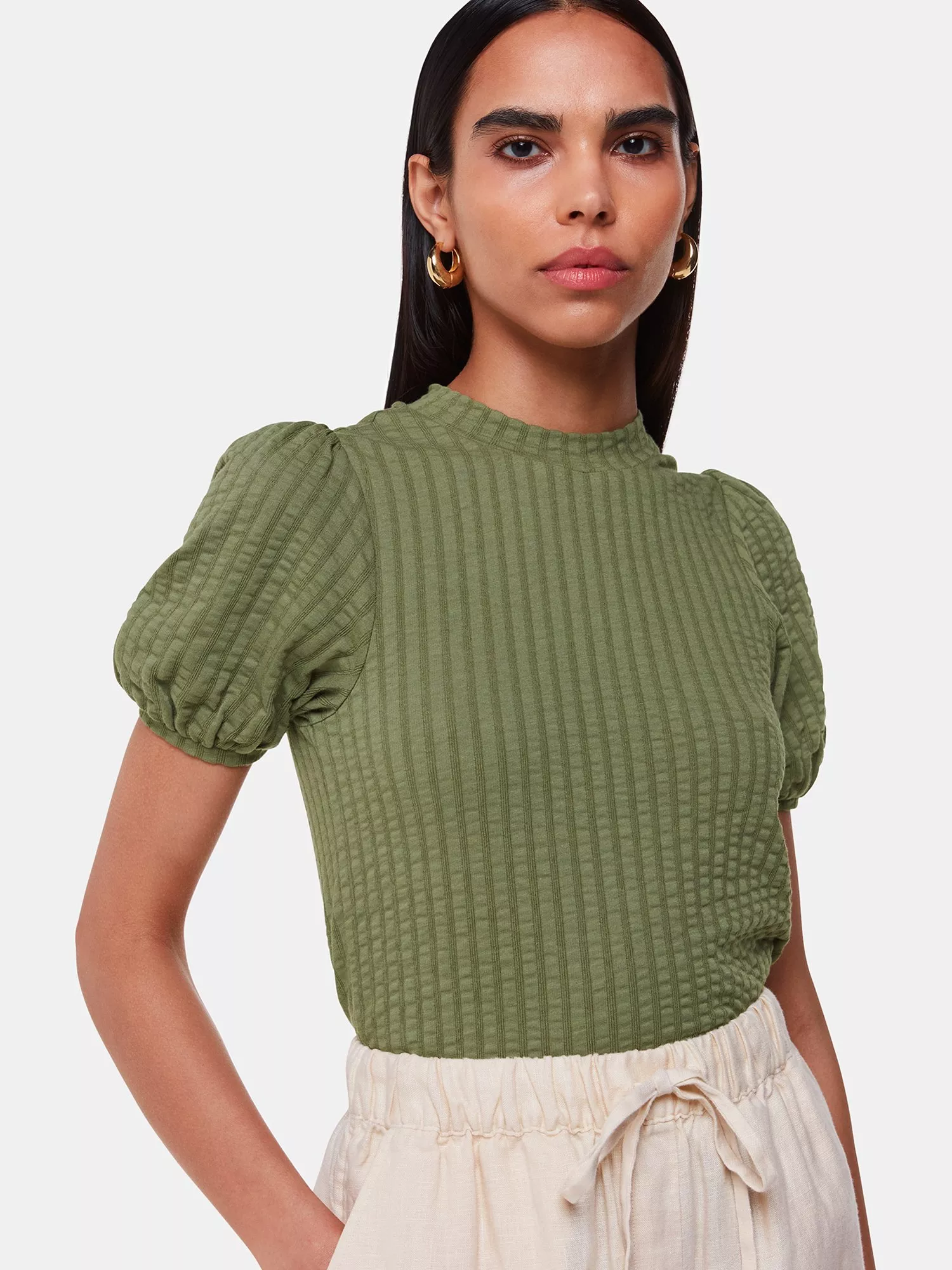 An all-year essential, this jersey top by Whistles is cut with a high neck, short puff ball sleeves and is made from a textured striped cotton blend. A great choice for everyday.