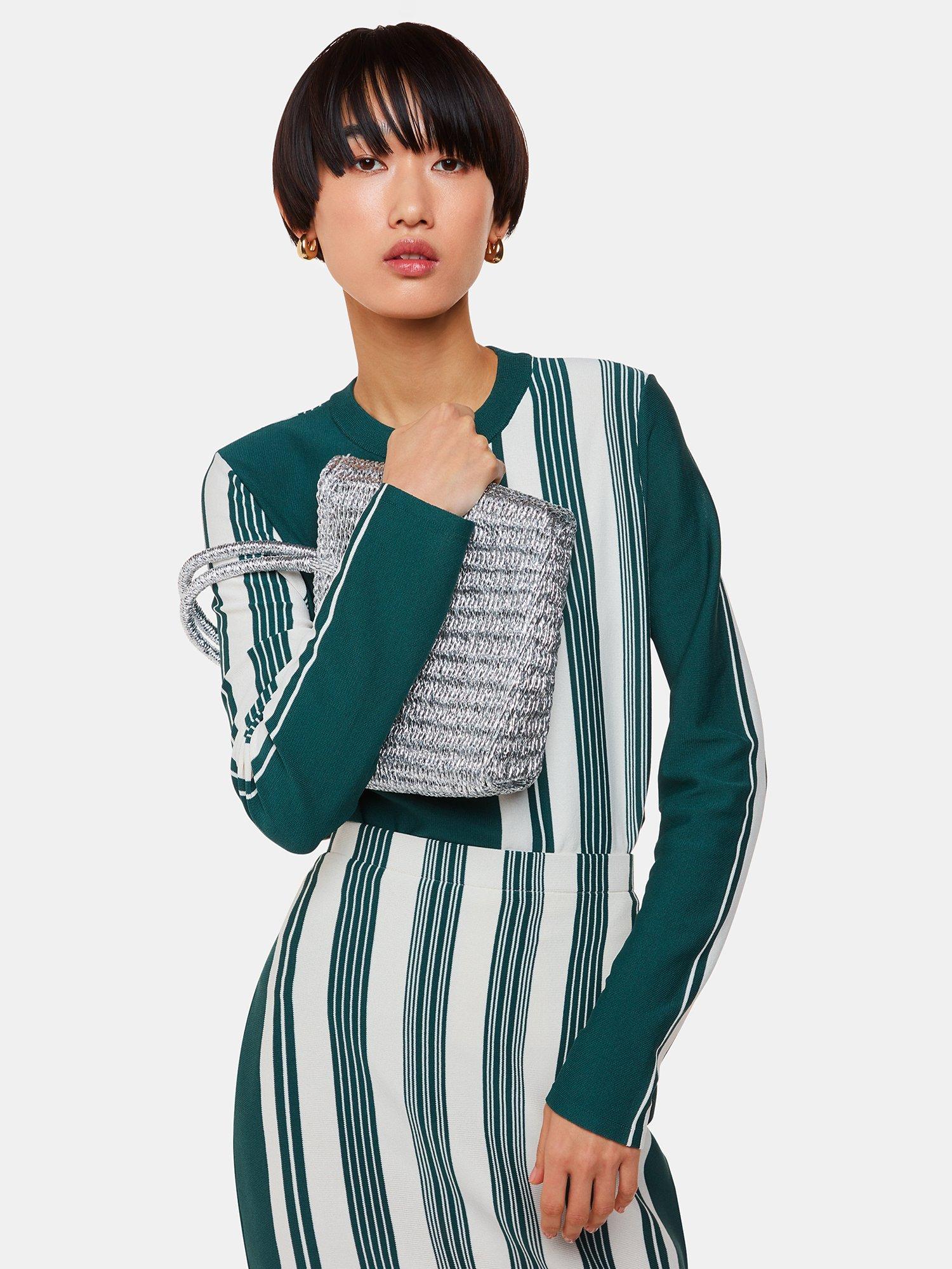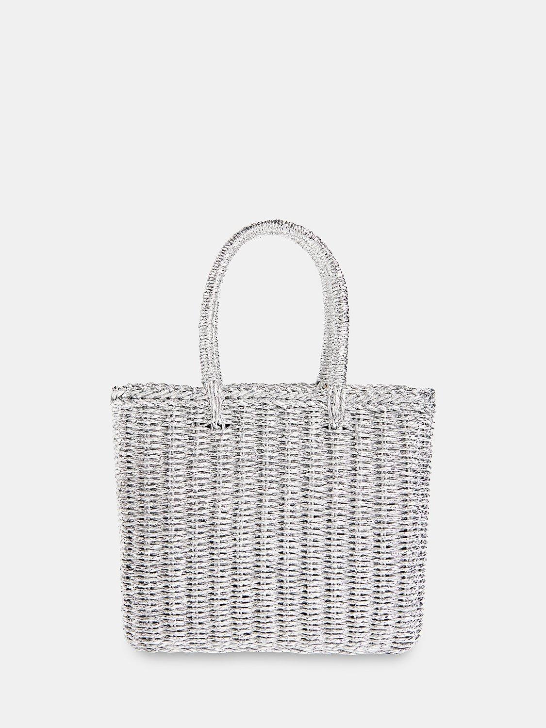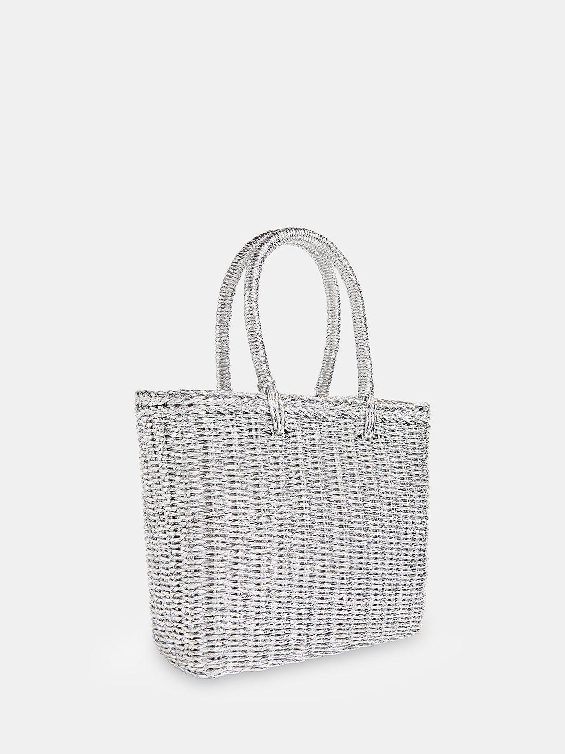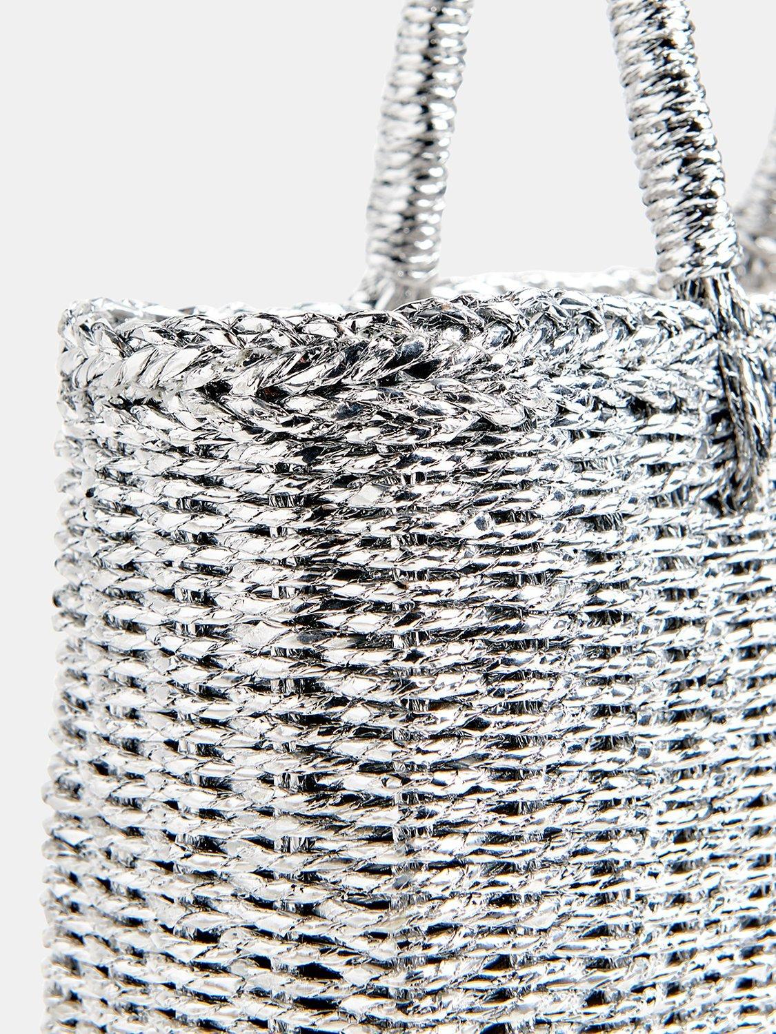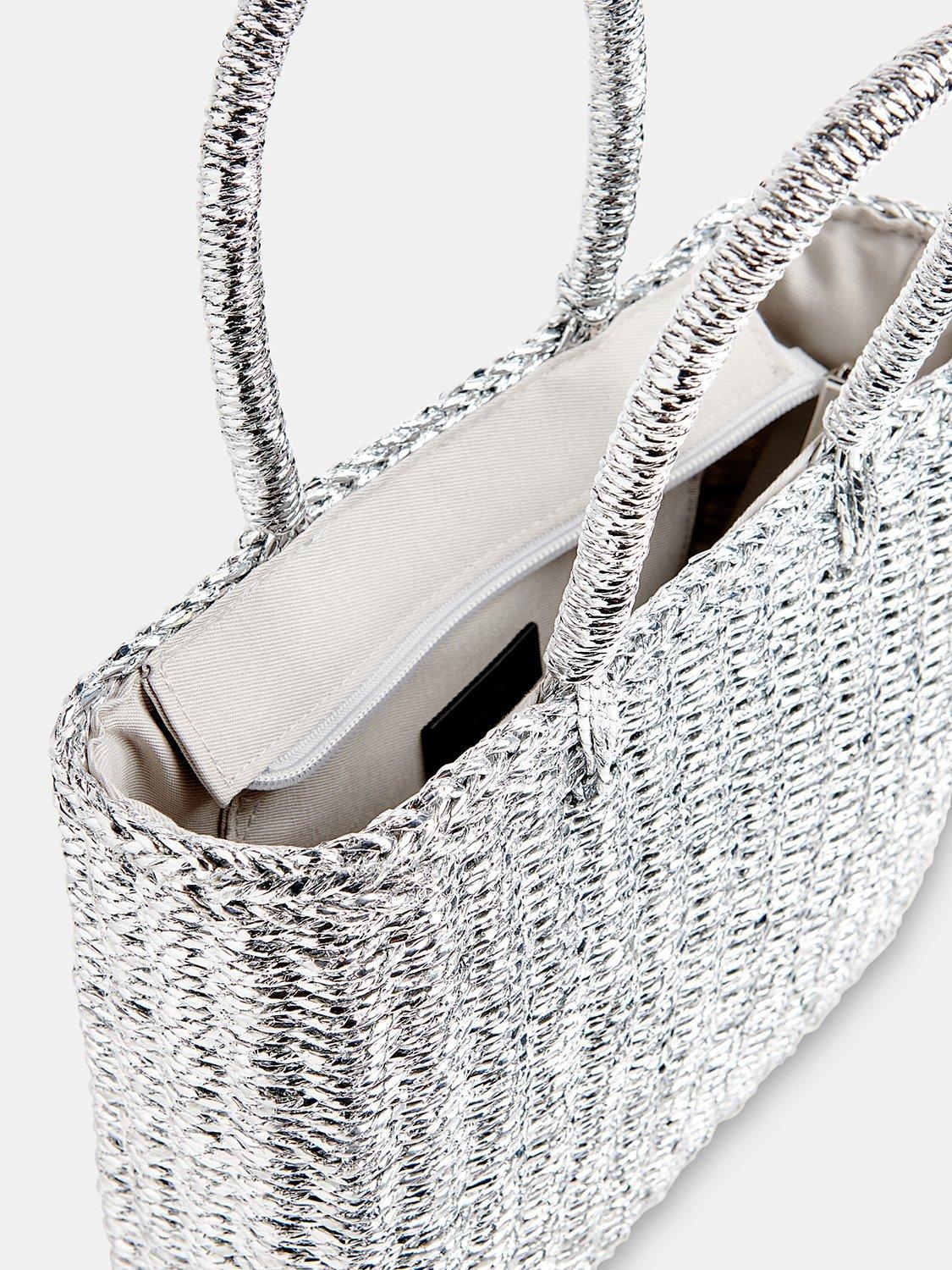 Woven from metallics and designed with a padded strap, it has an open top for access.