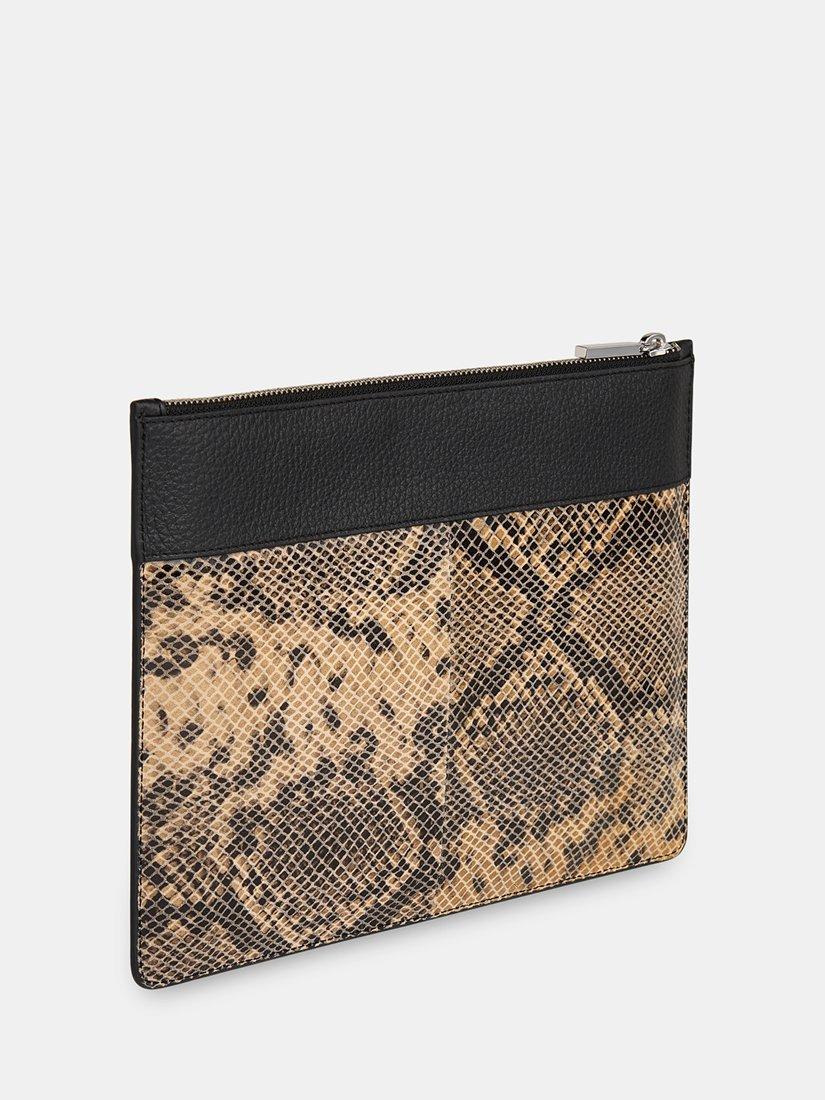 A leather clutch bag in an eye-catching snake print design.