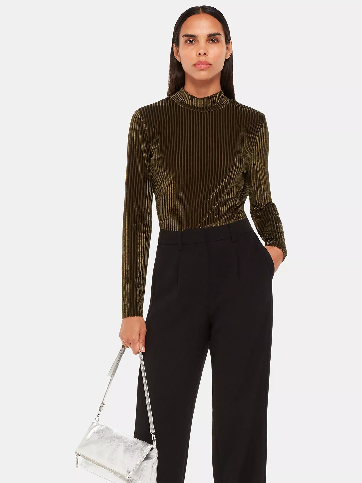 Cut with a conservative high neck and long sleeves, it is smoothly textured in velvet and is an easy daytime option.