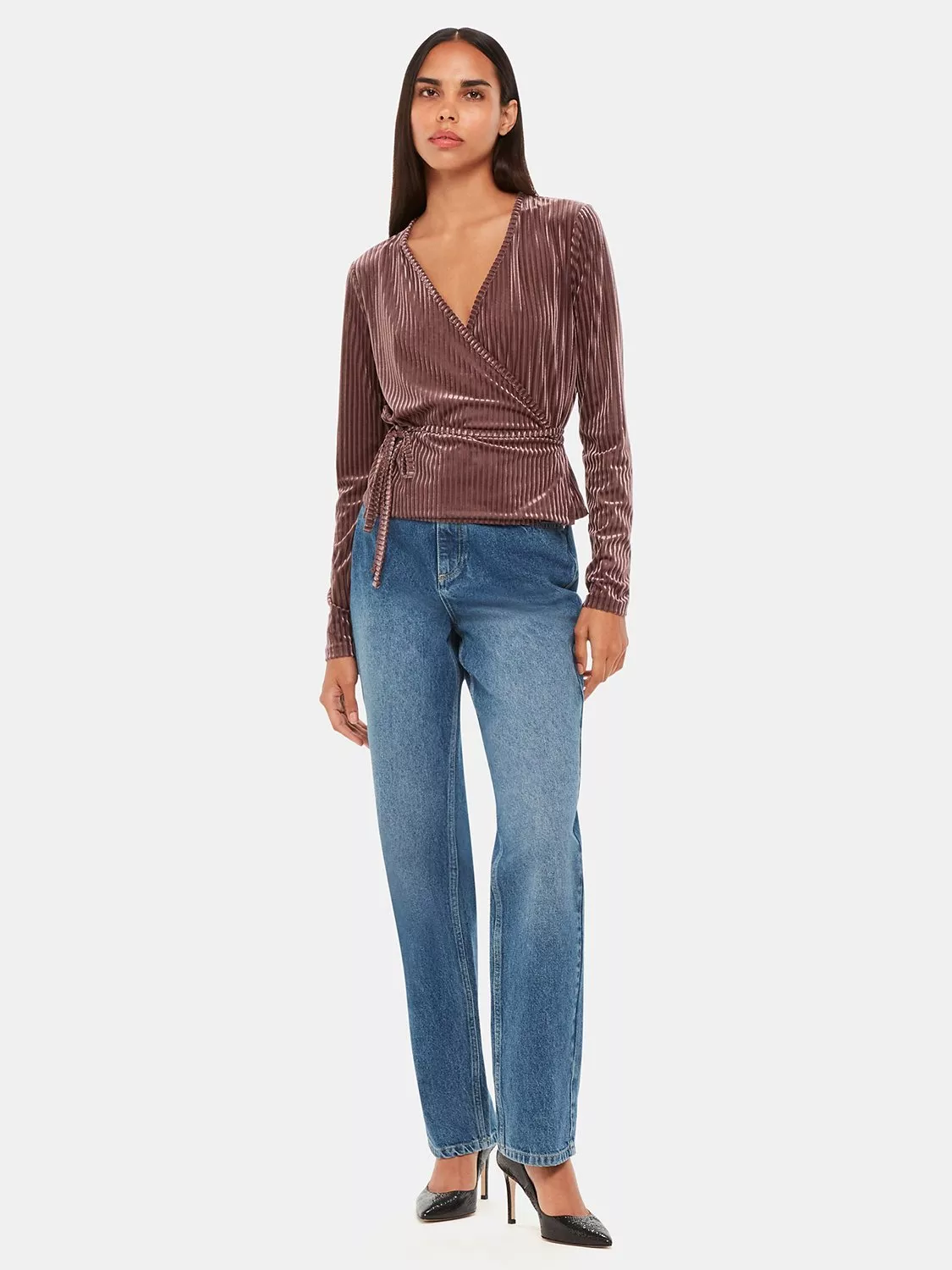 With a flattering v-neckline and long sleeves, it is smoothly textured in velvet and will slot seamlessly into your everyday staples.