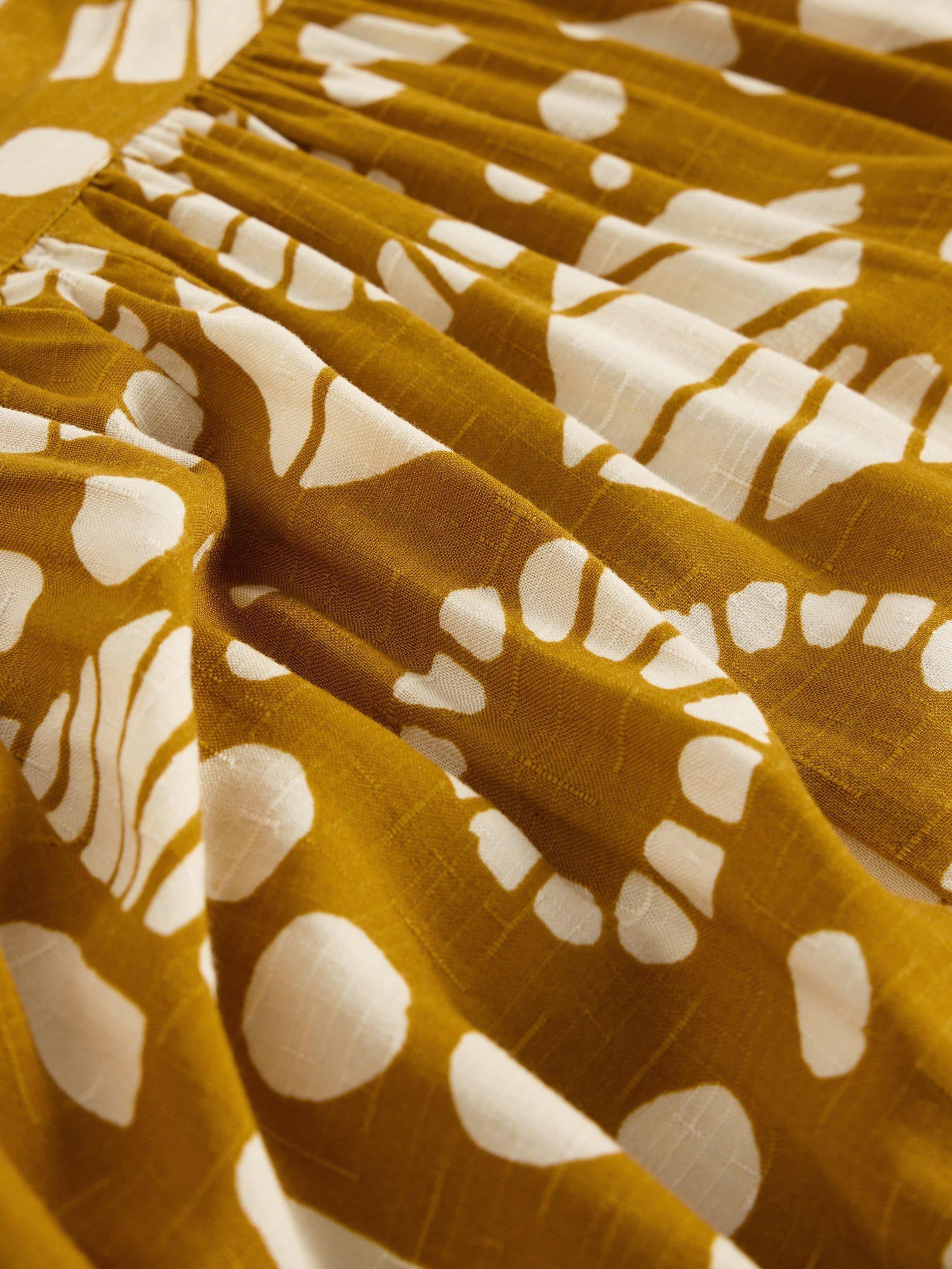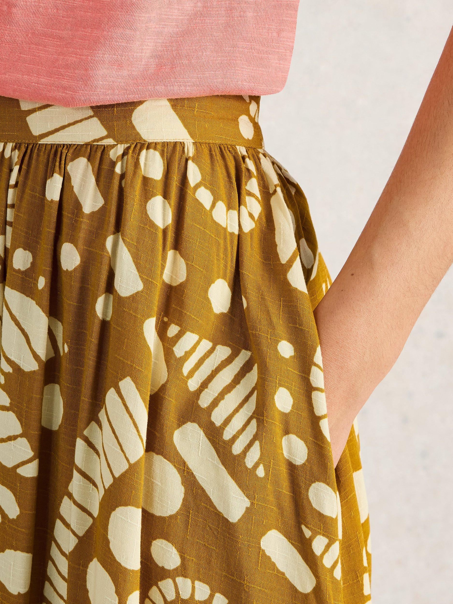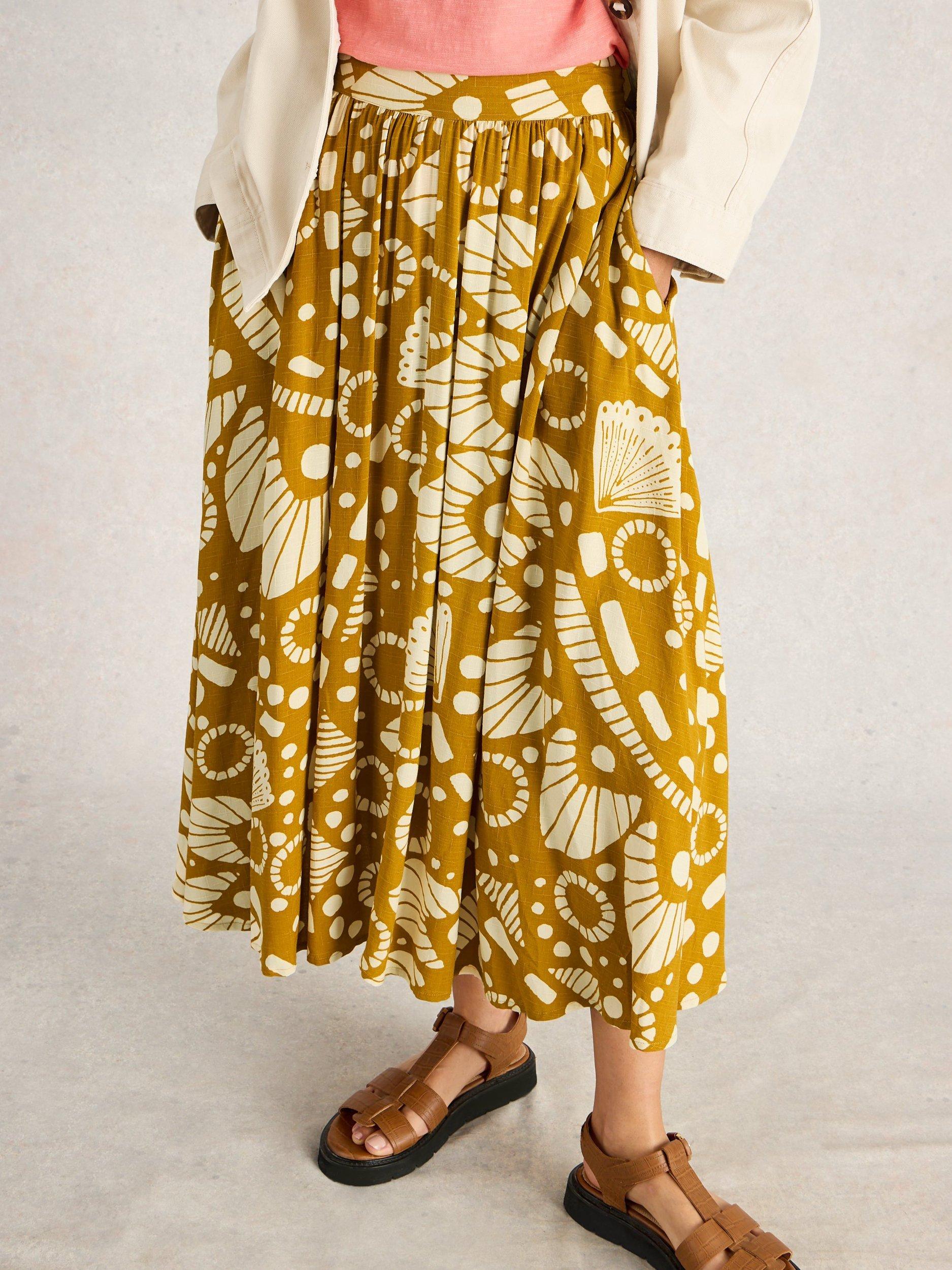 A flowy skirt that comes below the knee with elasticated waistband and side pockets.