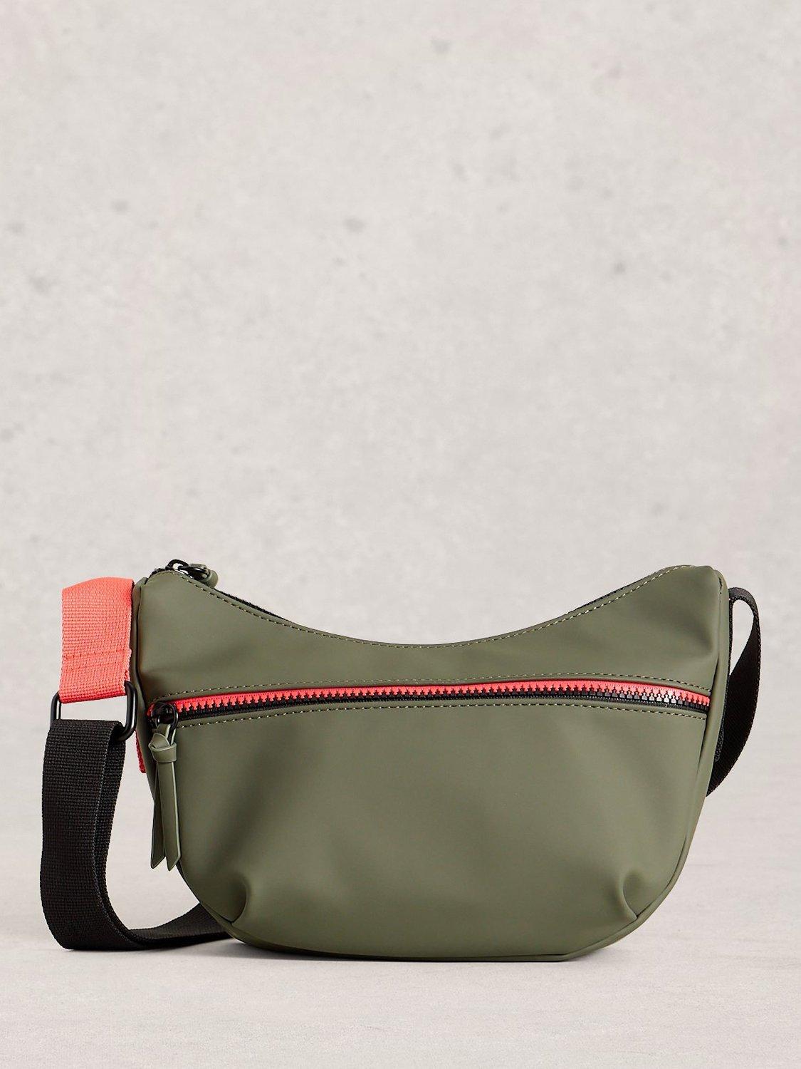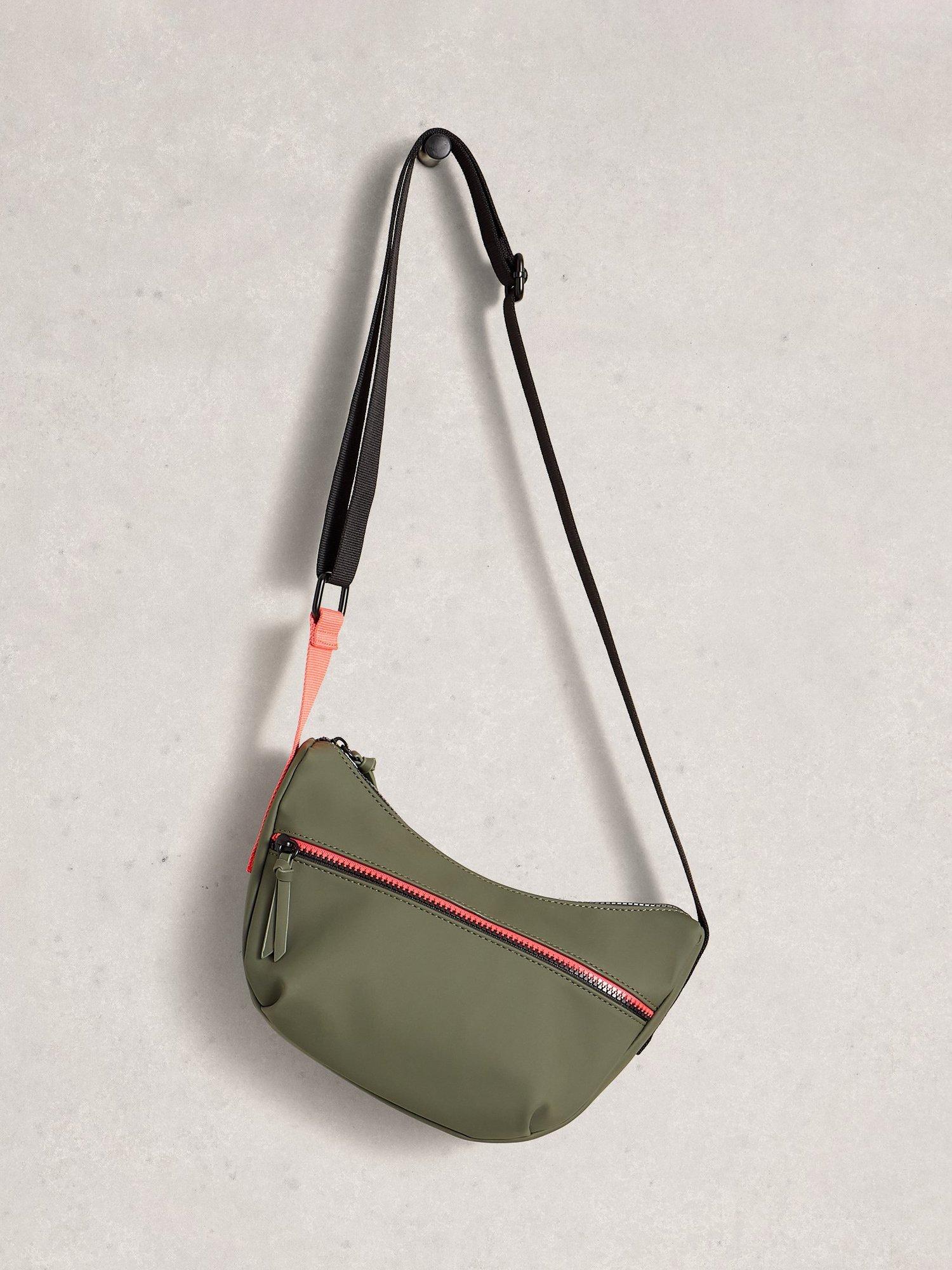 A crossbody bag with a colour pop front zip. Great for dog walks and practical days out with an adjustable webbing strap.