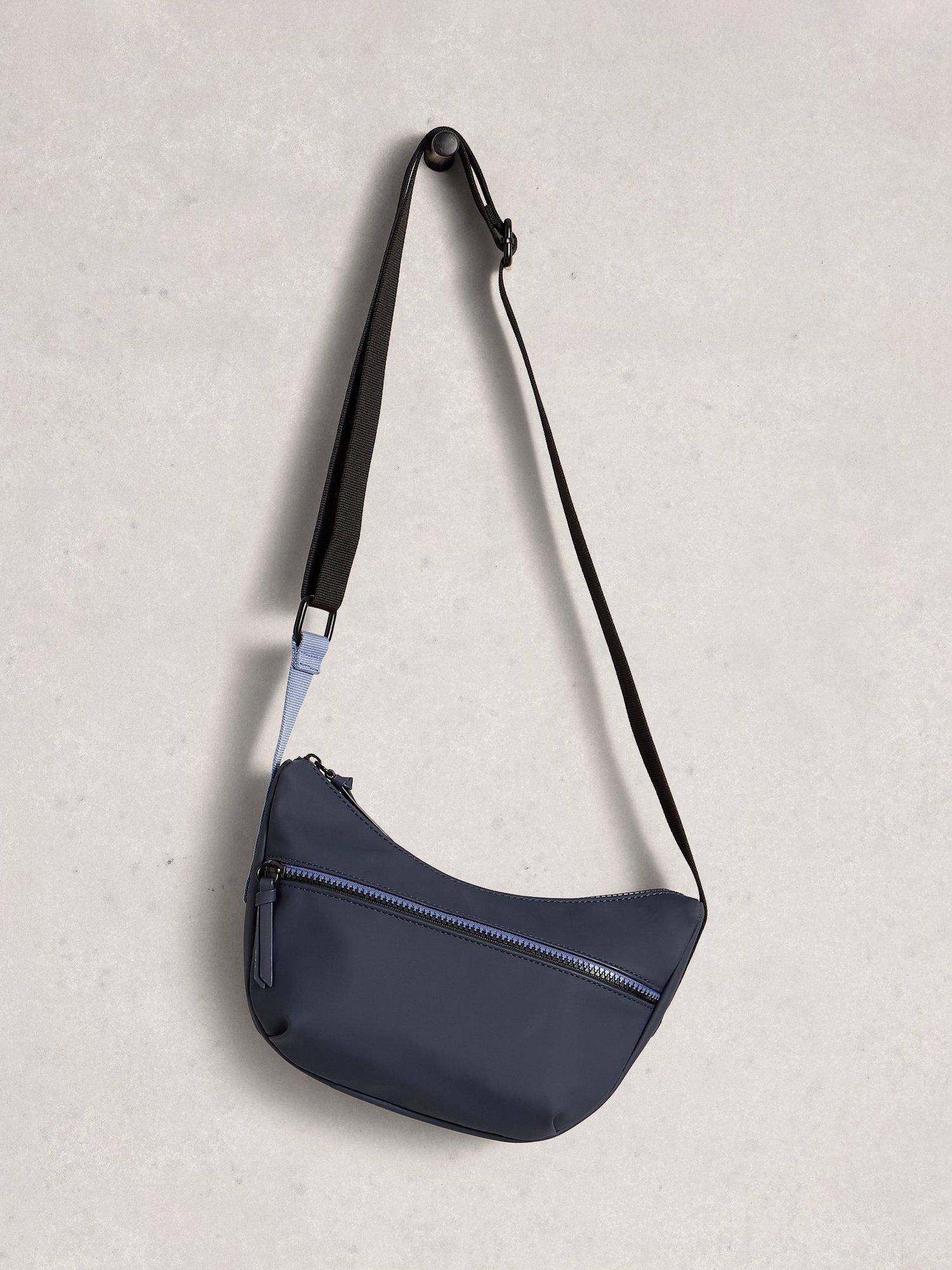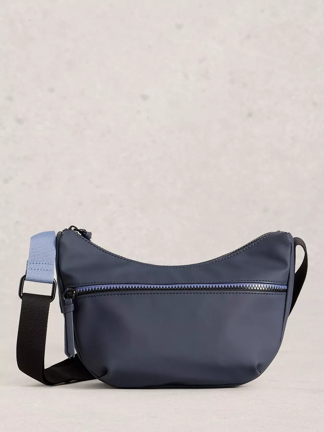 A compact cross-body with a rubberised PU finish and a colourpop front zip. Completed with an adjustable webbing strap.