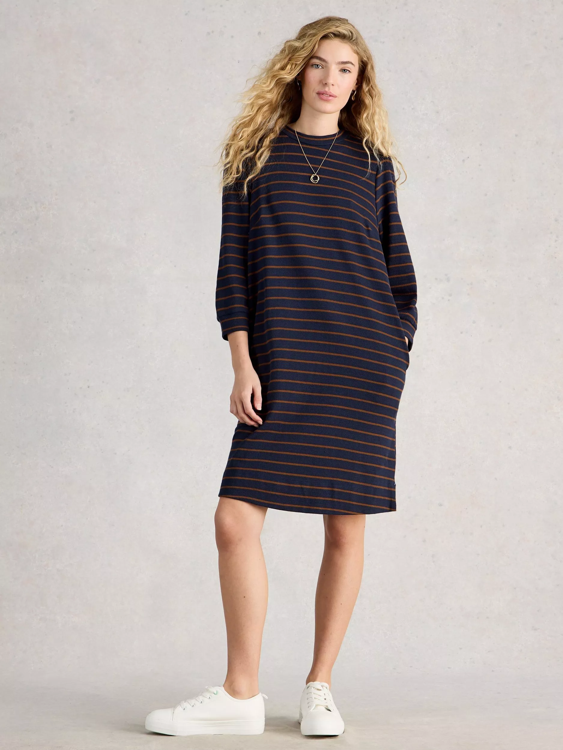 A stripey jersey sweater dress with button detailing at the shoulder. This one is 100% cotton.