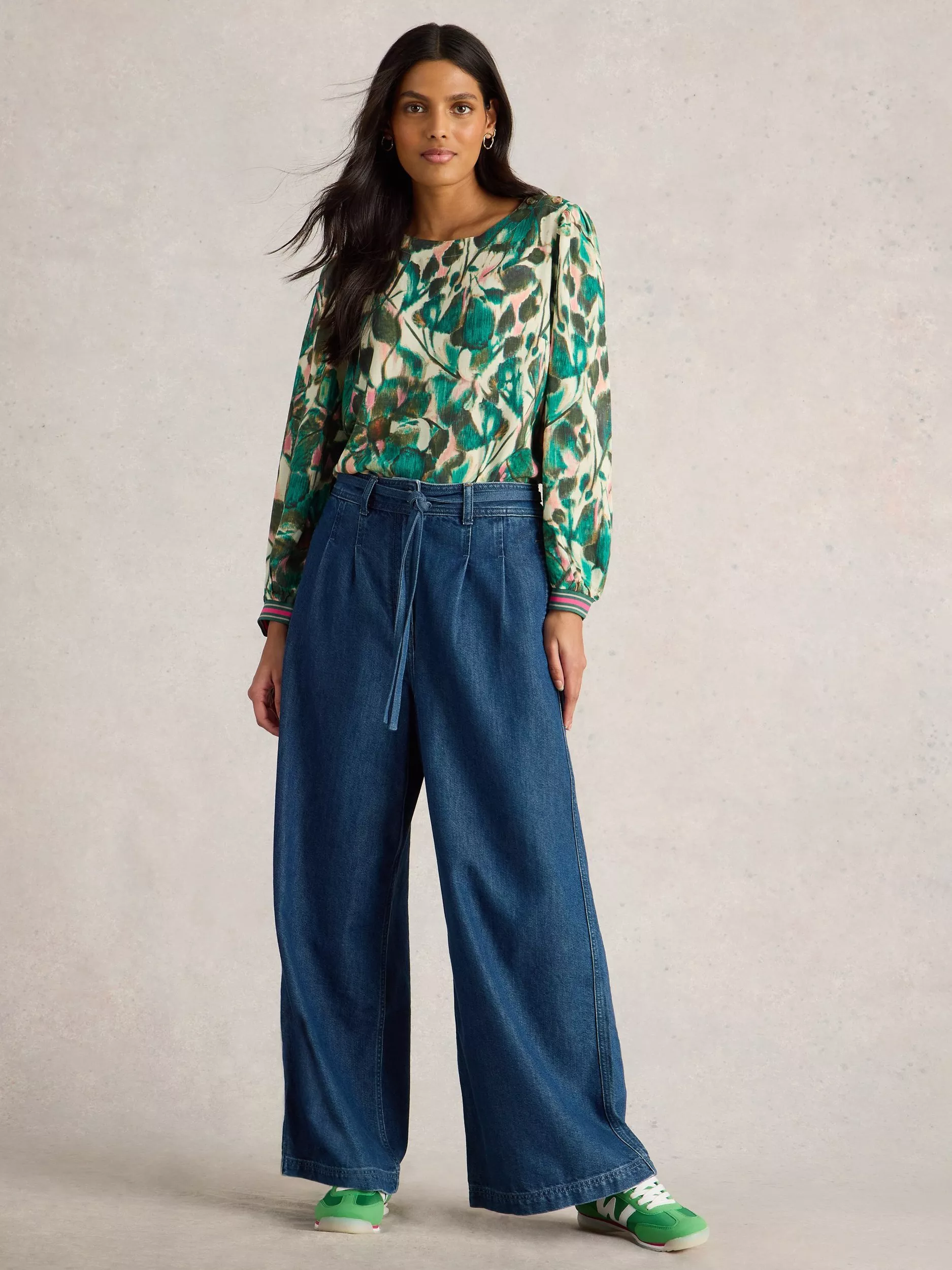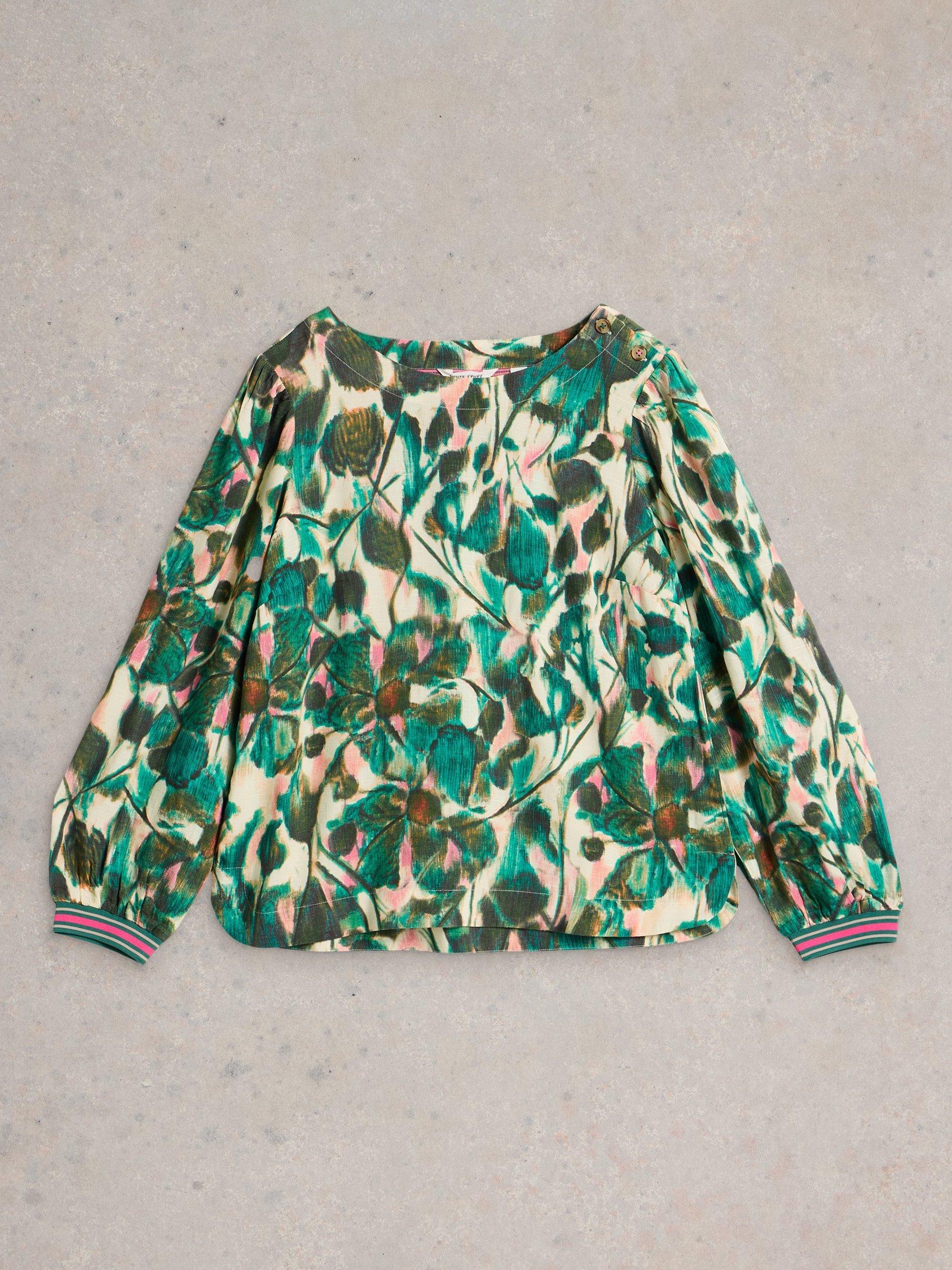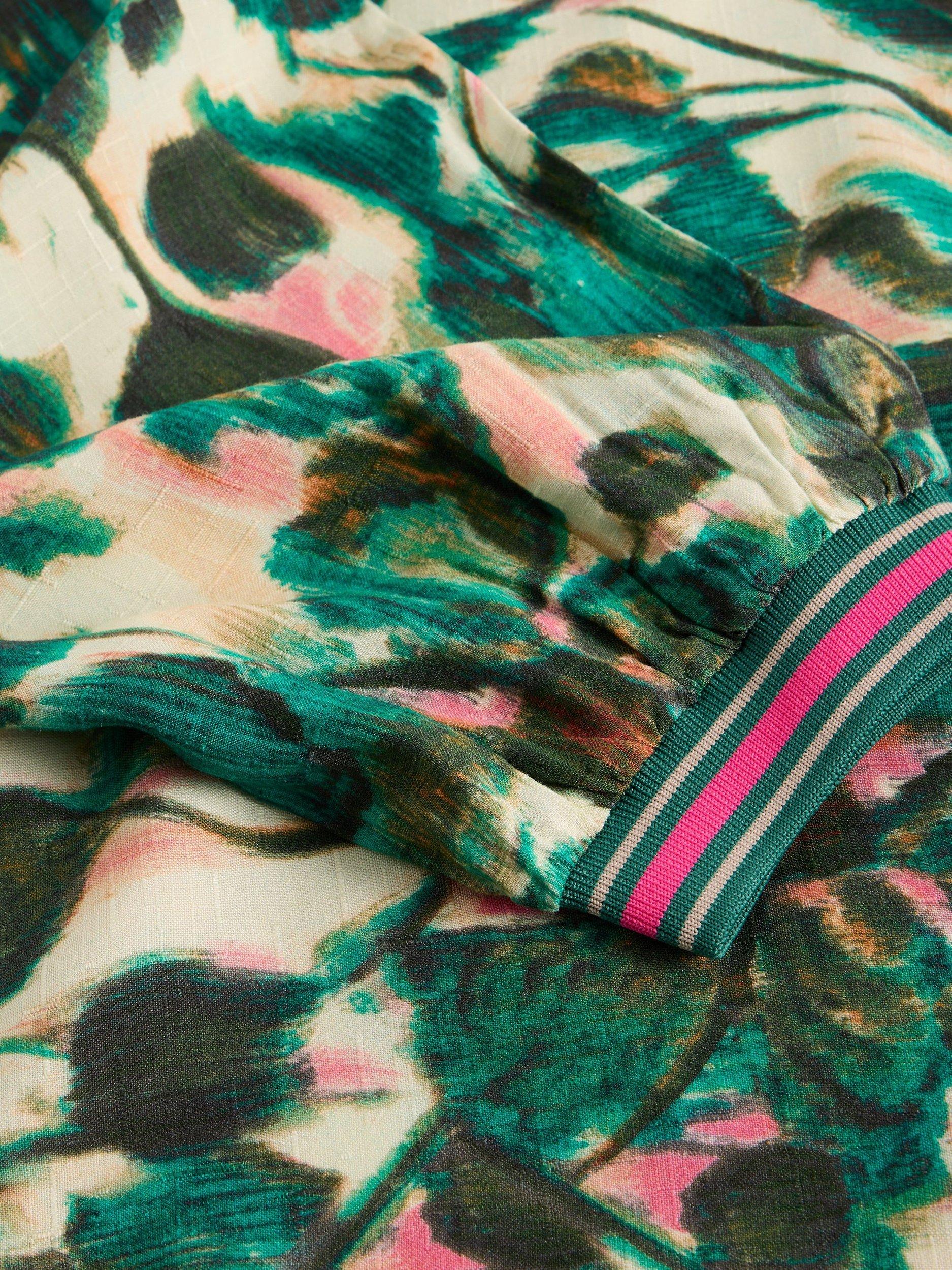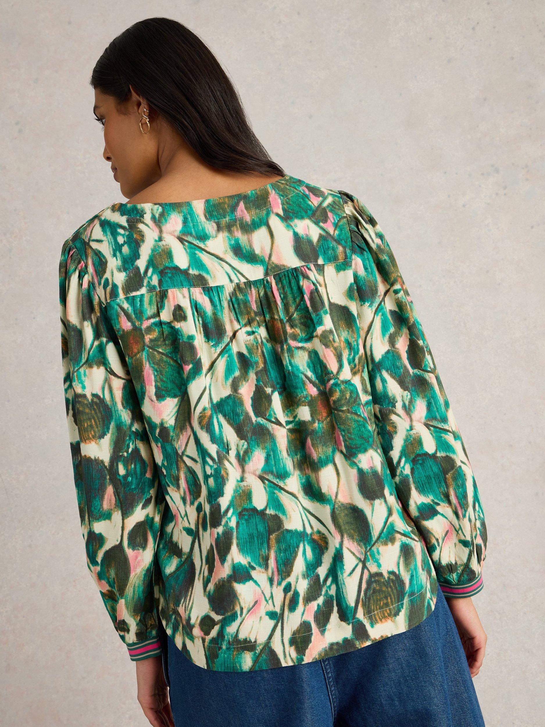 A round neck viscose printed top with elasticated cuffs.