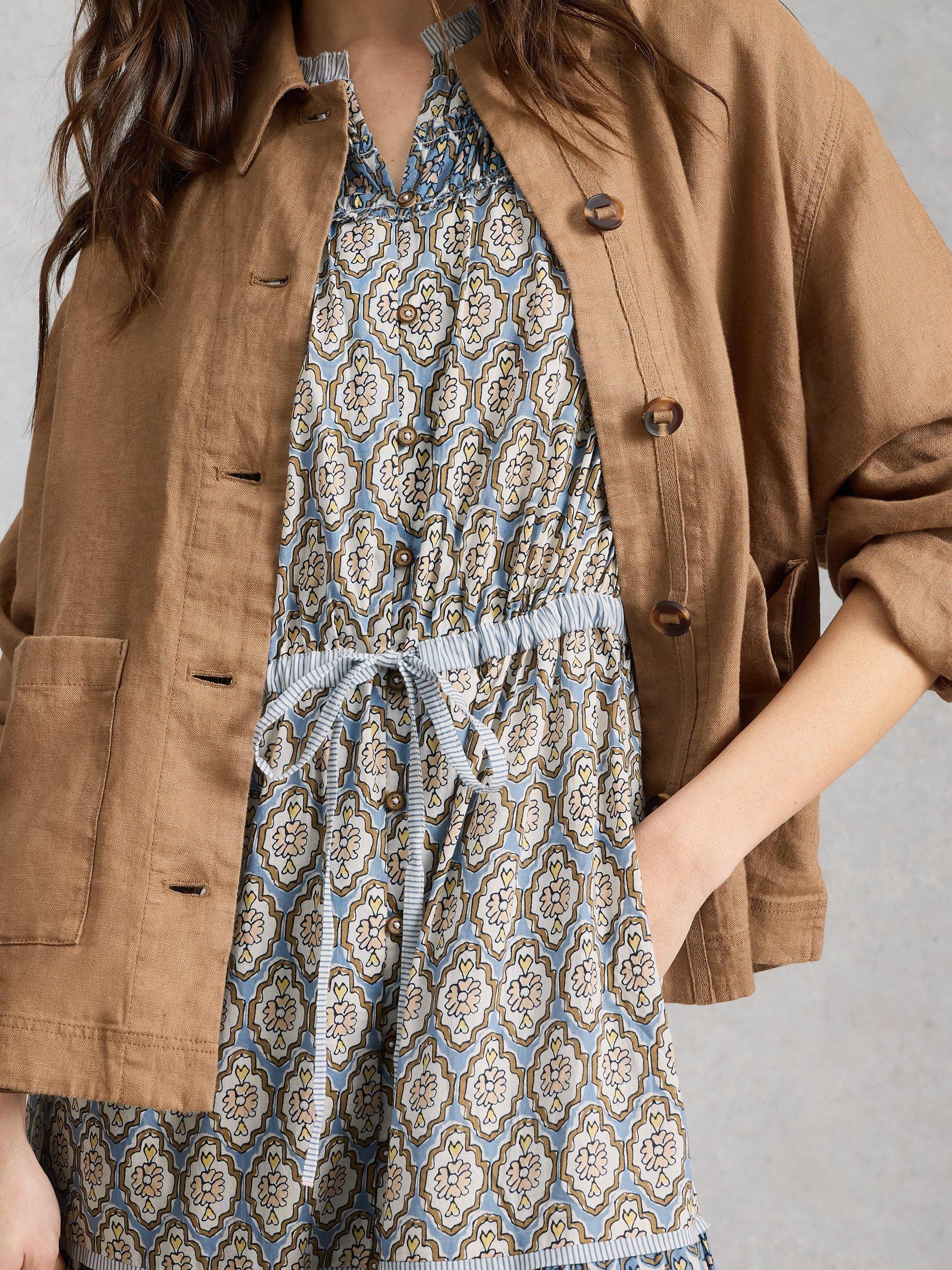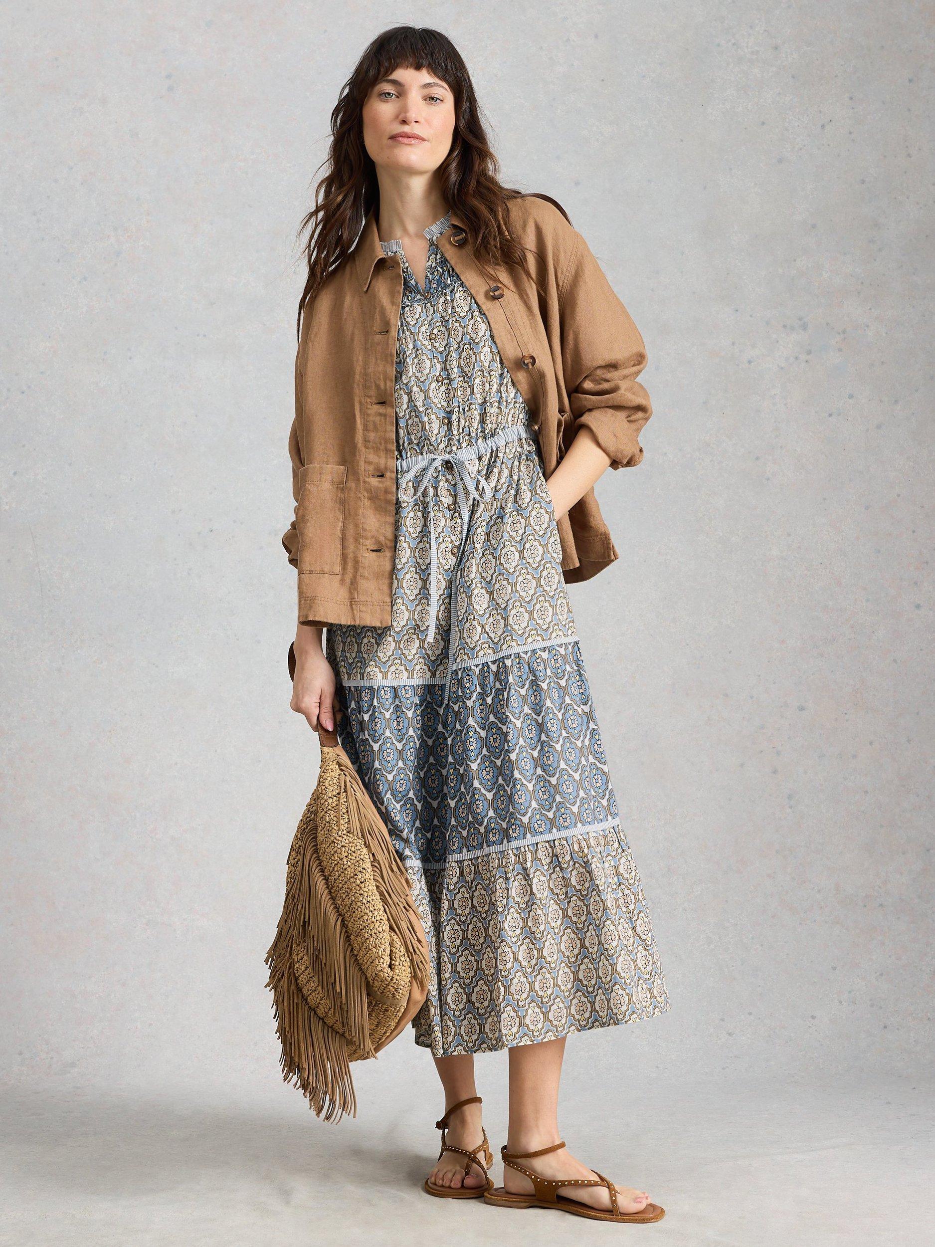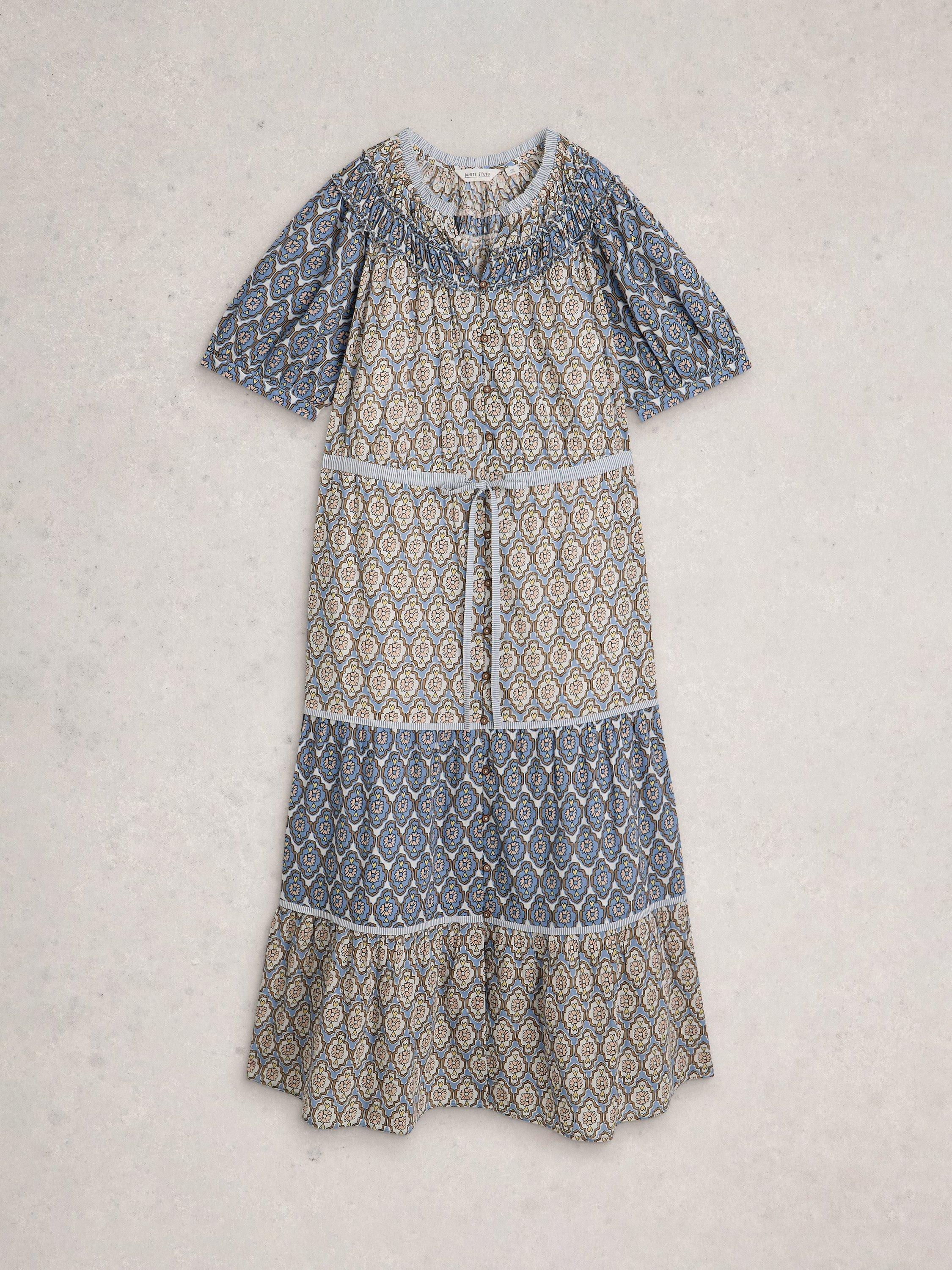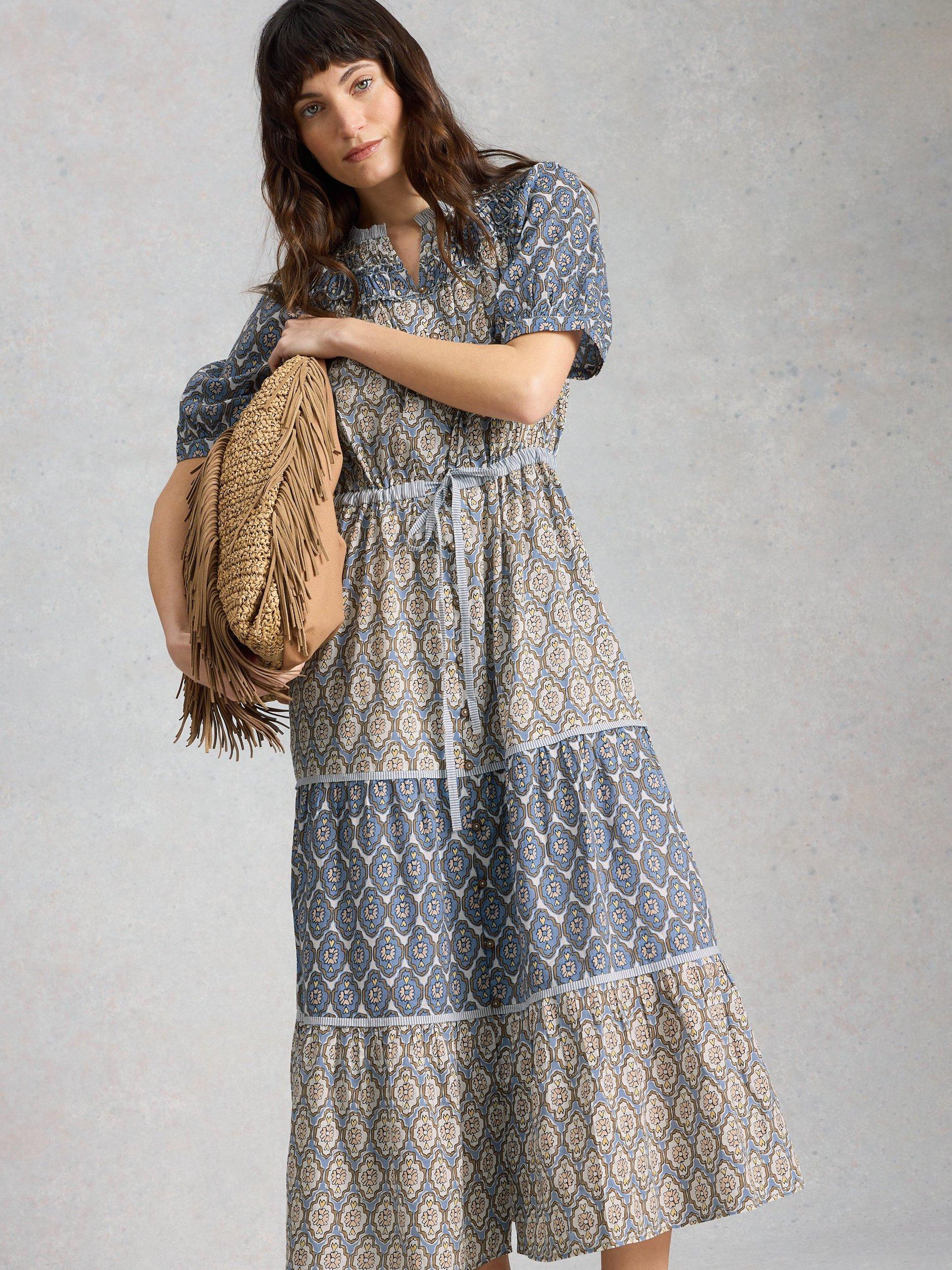 Softly layered tiers add movement to a fit and flare cut. This short puff sleeve pure cotton midi dress by White Stuff features a V-neck and keeps things abstract when it comes to the pattern.